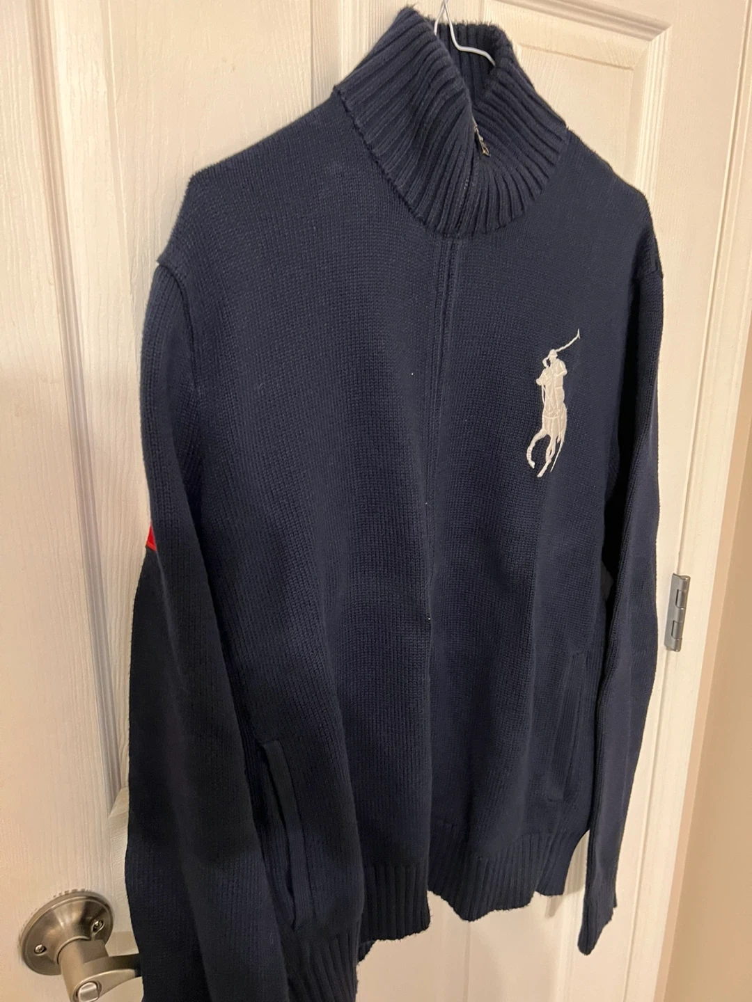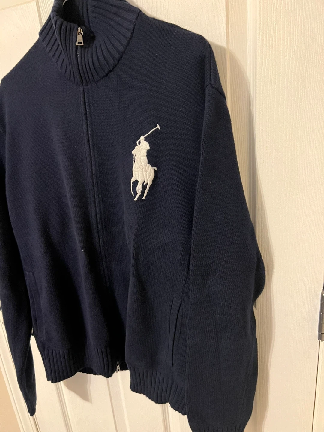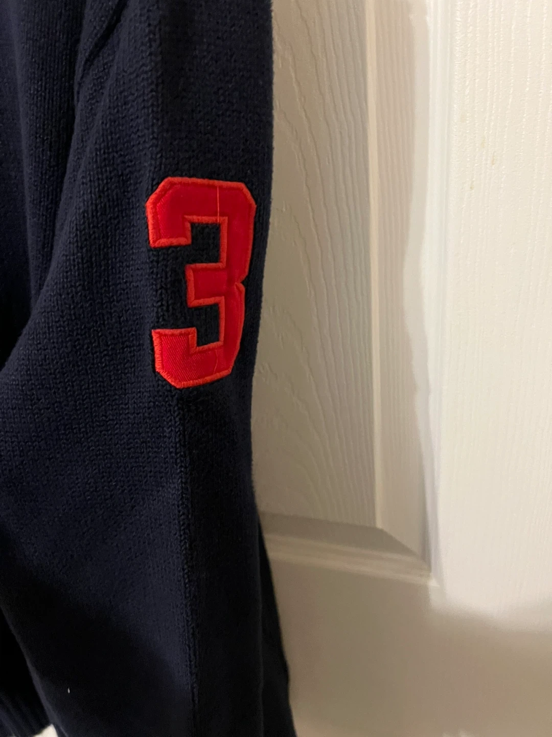 Selling a Ralph Lauren navy blue knit zip up sweater. It features the iconic polo player logo in white and a red number 3 on the sleeve. It's in great condition and perfect for layering