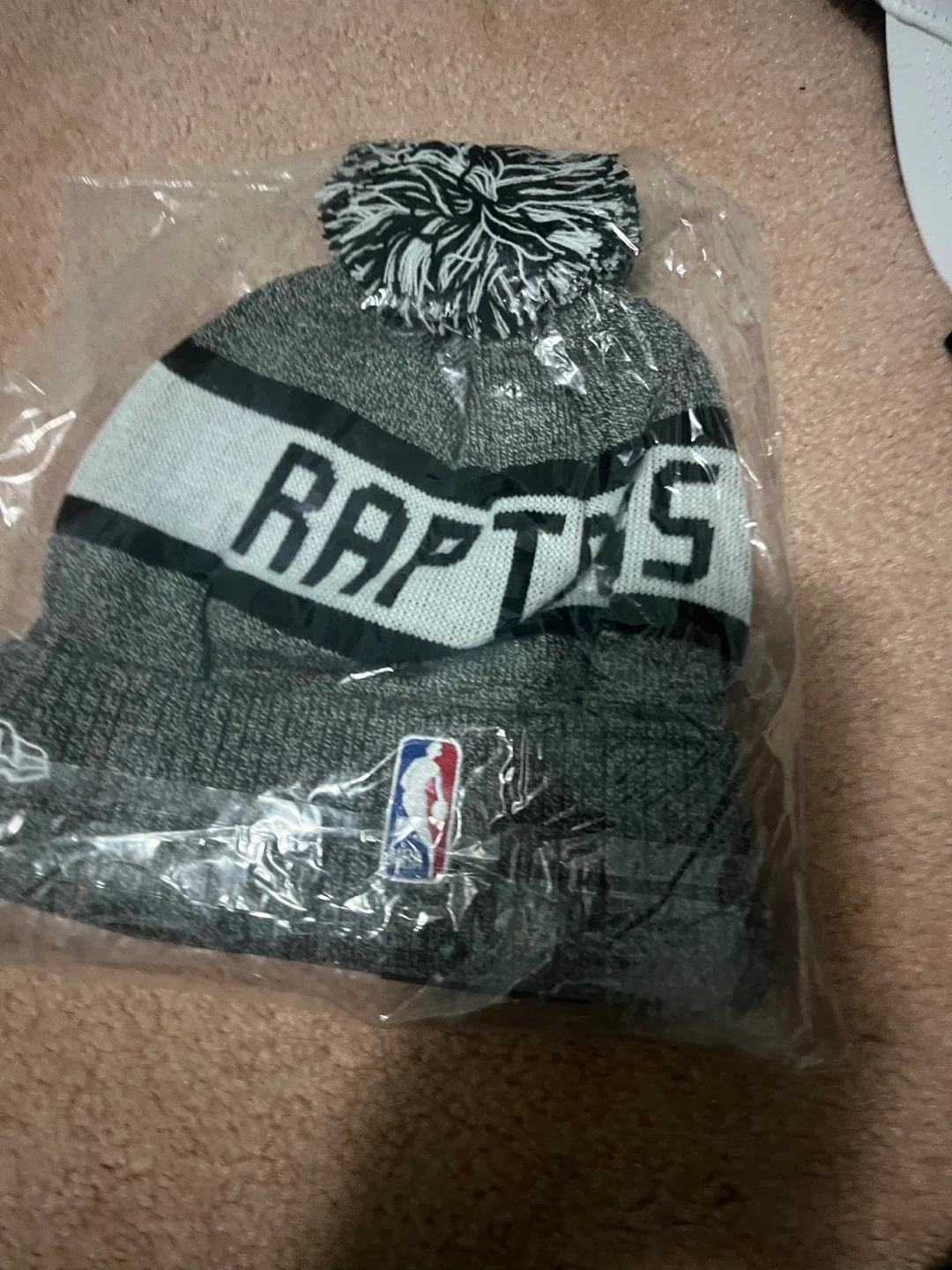 91Selling a brand new New Era Toronto Raptors knit beanie with a pom on top! It's gray and black with the Raptors logo and 'Raptors' written across the front. Never been worn and still in the original packaging