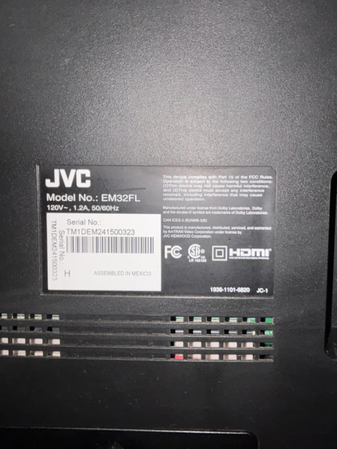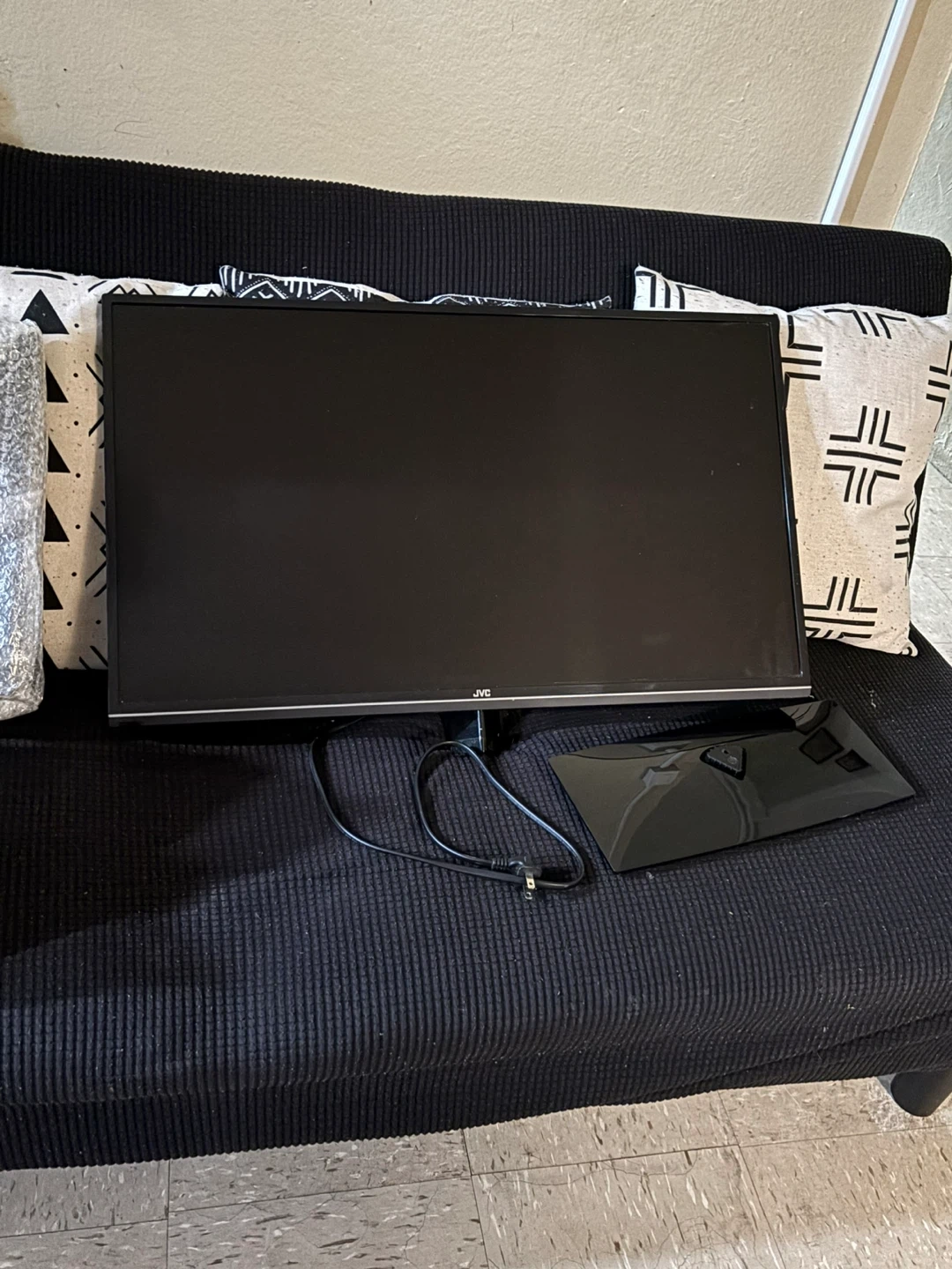 Selling a 30’ JVC TV in black color. It's in used condition and ready for a new home! Perfect for a smaller space or as a secondary screen. In great condition. (PICK UP ONLY)