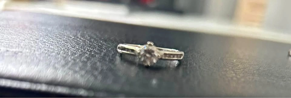 One diamond ring, size 6.5, set in 19kt white gold. It features a 0.53ct round brilliant H SI2 diamond (Item # LD 126713). It's also set with 12 full cut round diamonds, 0.121twt, SI1-2 clarity, HIJ color. Cash only.