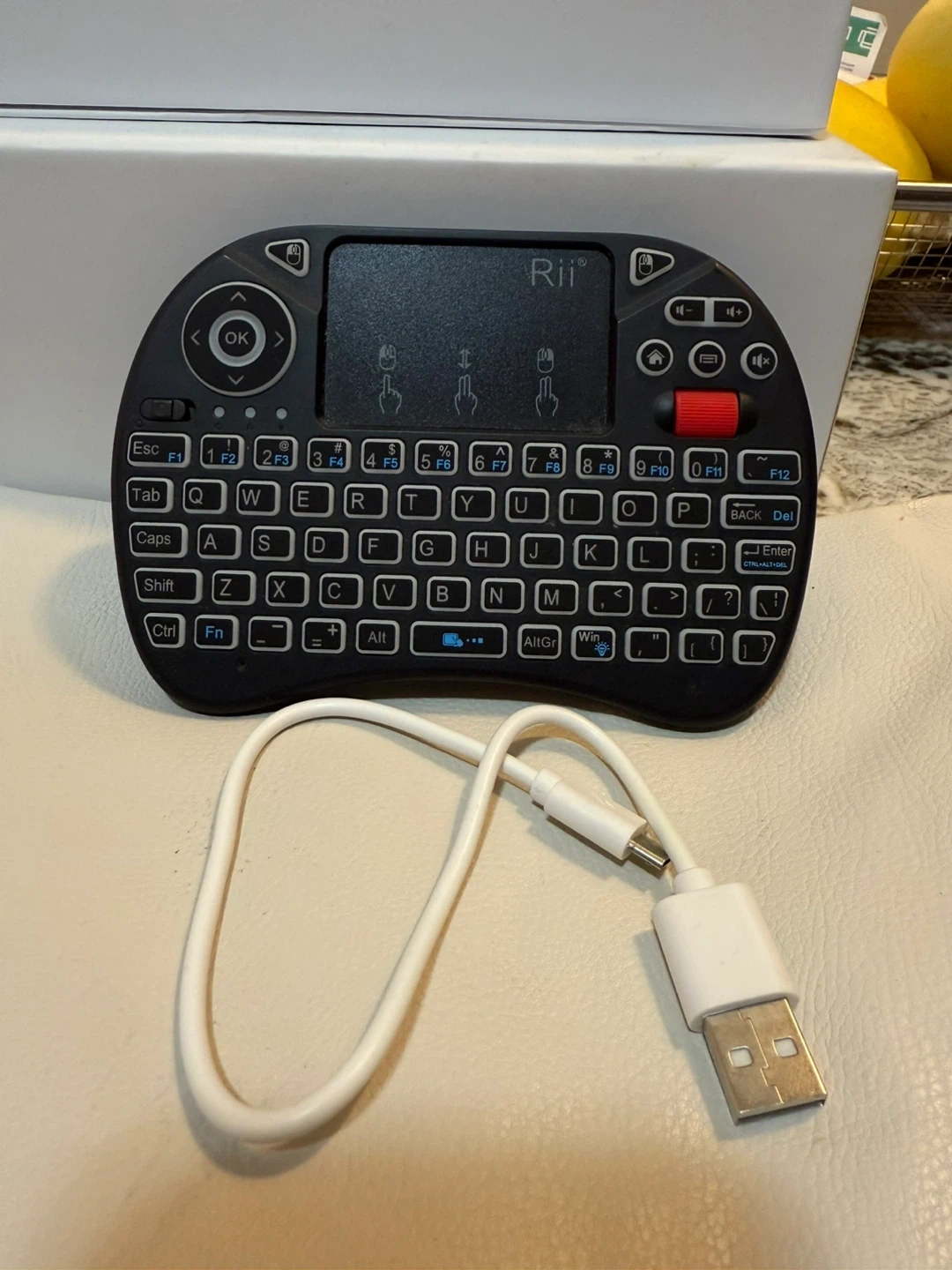 Compact and convenient wireless mini keyboard with built-in touchpad and backlit keys (model similar to Rii Mini i8). Great for use with smart TVs, Android boxes, computers, or projectors. Features a rechargeable battery and 2.4GHz USB receiver for plug-and-play use — no drivers needed.