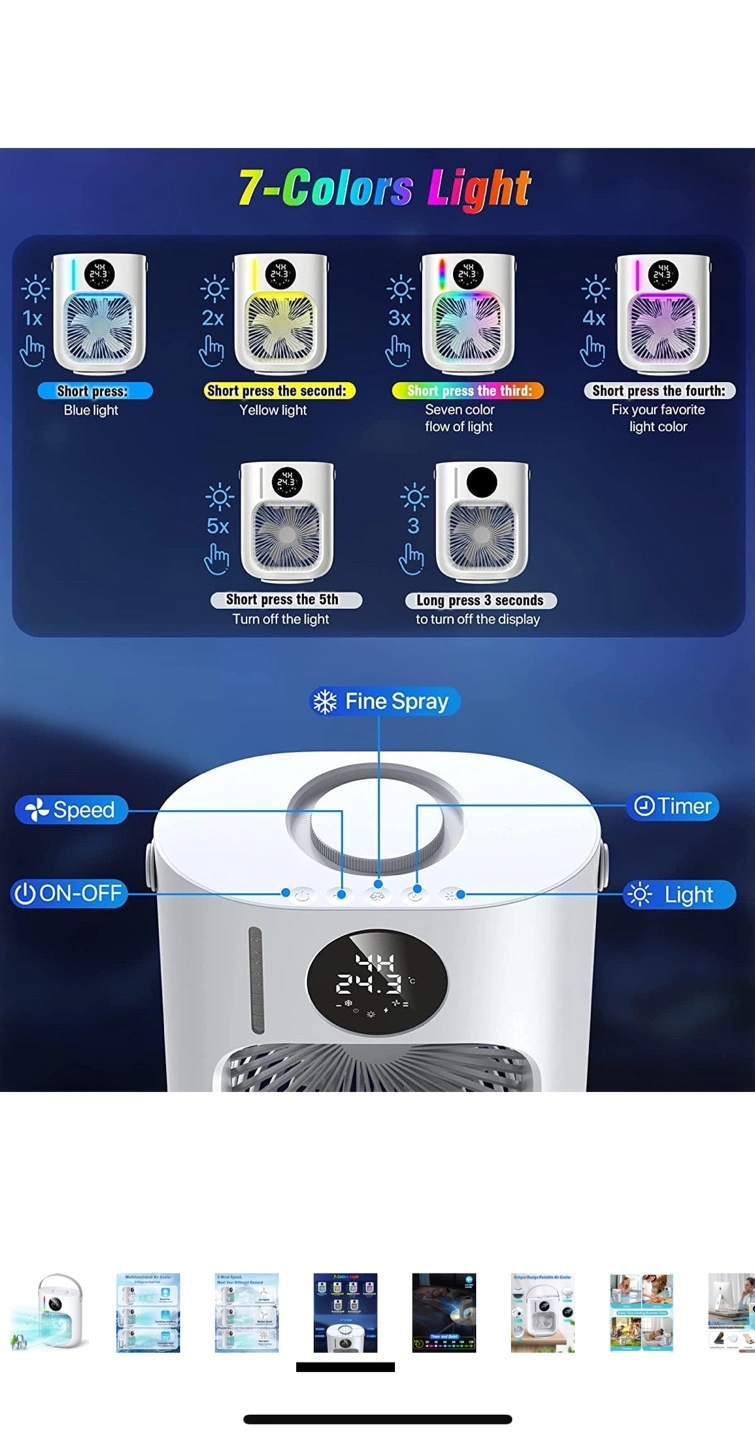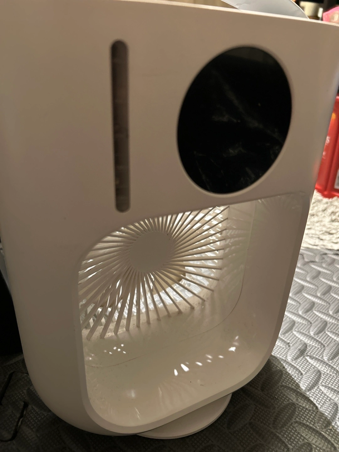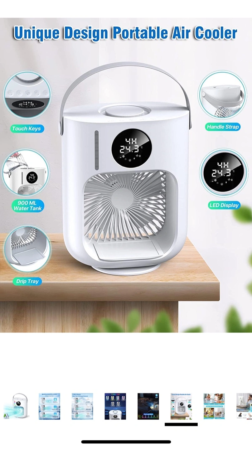 This portable air cooler features a unique design and comes with a handle strap for easy carrying
