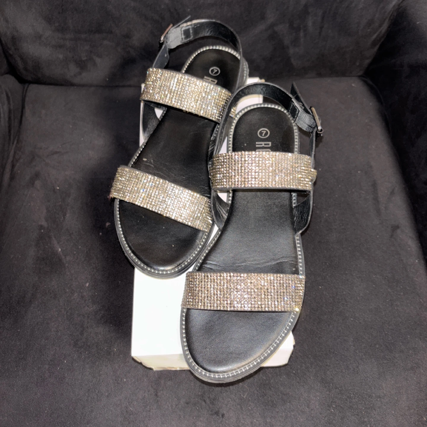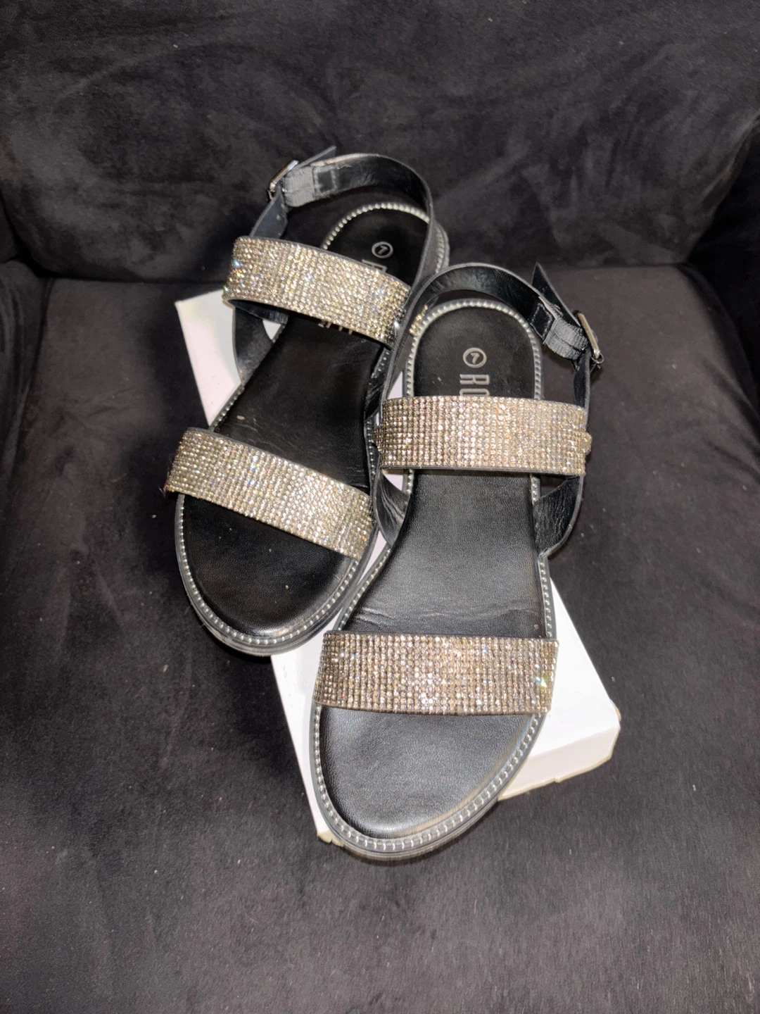 These are a pair of Rouge Helium sandals in size 7. They feature sparkly rhinestone straps and black soles. They're in good used condition, ready for a new home!