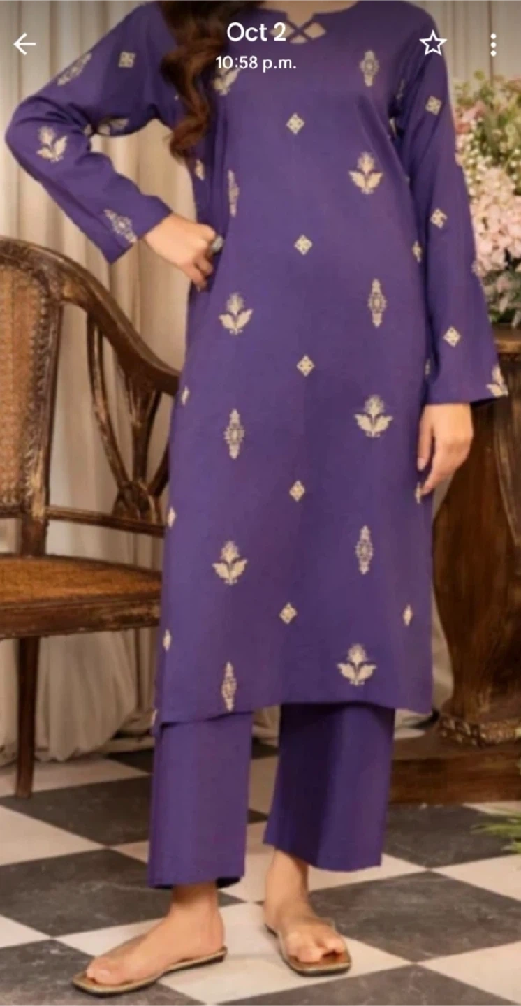 Selling a beautiful purple salwar kameez suit with delicate embroidery. Perfect for party wear or everyday wear. The colour is a lovely shade of purple, and the embroidery adds a touch of elegance to the outfit.
