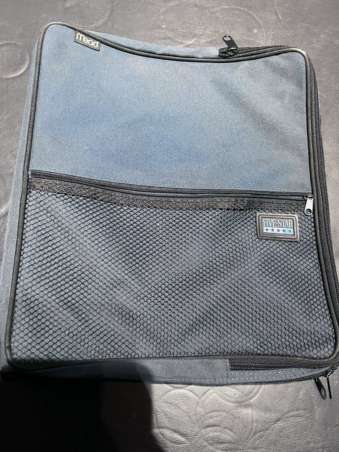Mead Five Star zipper binder in good condition. It has a mesh pocket on the front and a three-ring binder inside. Perfect for keeping your schoolwork organized!