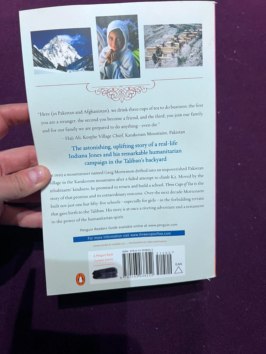 Selling the book Three Cups of Tea by Greg Mortenson and David Oliver Relin. It's a New York Times bestseller. This book tells the story of one man's mission to promote peace, one school at a time. A great read!