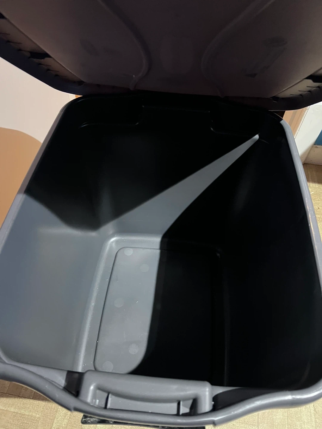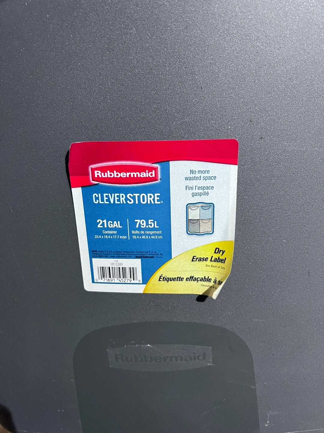 Selling a Rubbermaid Clever Store container! It's a 21-gallon container, perfect for storage. Measures 23.4 x 18.4 x 17.7 inches (59.4 x 46.8 x 44.9 cm). Great for keeping things organized!
