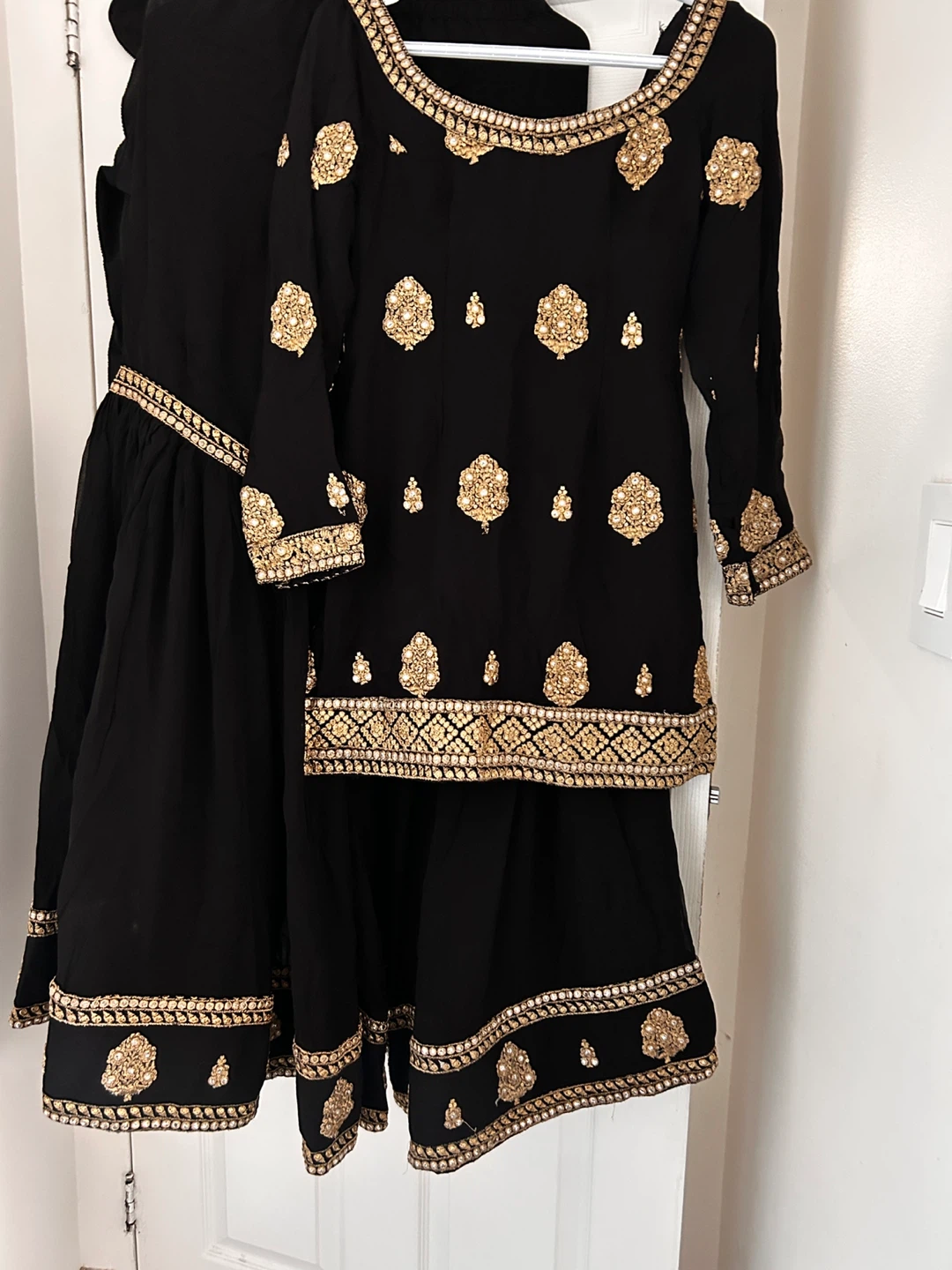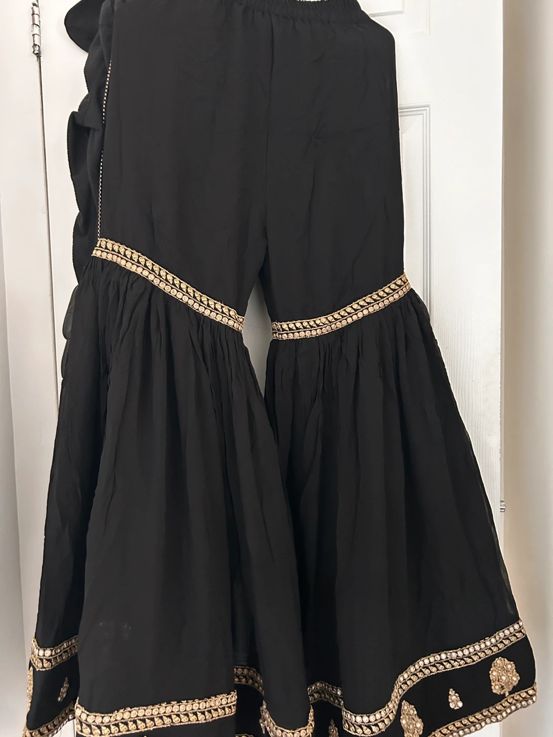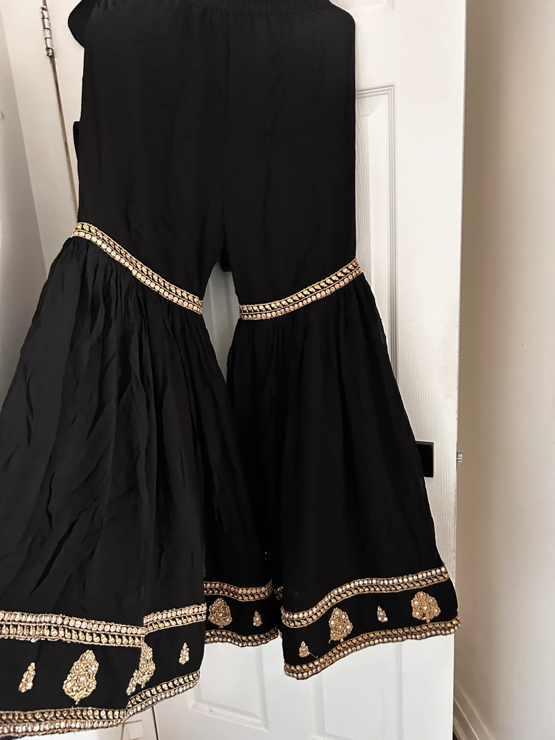Beautiful black gharara with gold detailing. This set includes the kameez (top), gharara (pants), and dupatta (scarf) with heavy work on it. Perfect for a special occasion or festive event!