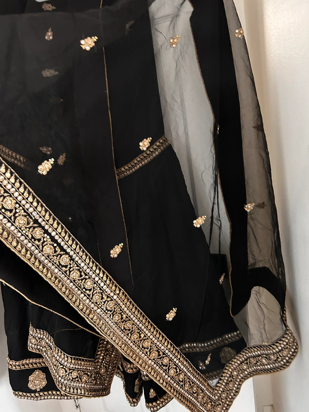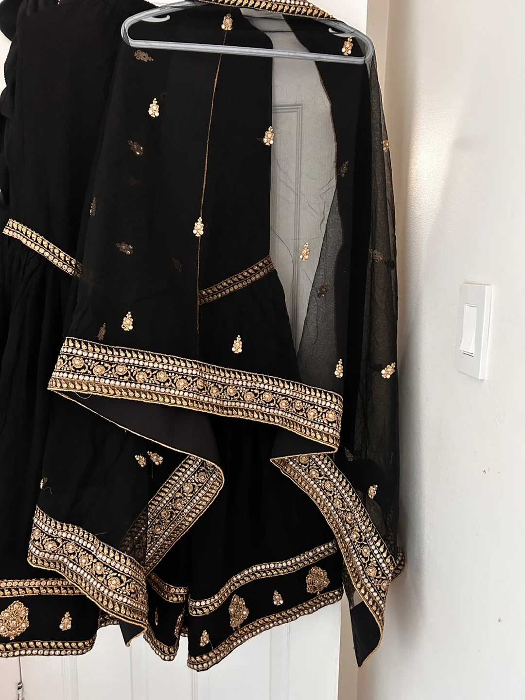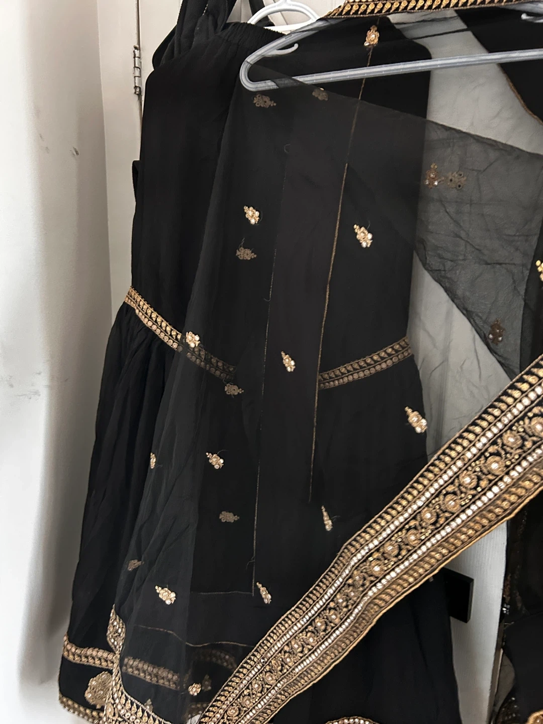 Beautiful black gharara with gold detailing. This set includes the kameez (top), gharara (pants), and dupatta (scarf) with heavy work on it. Perfect for a special occasion or festive event!