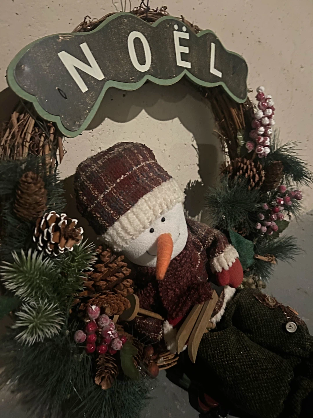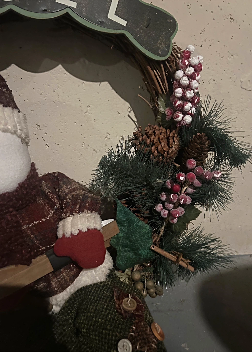 Get ready for the holidays with this rustic festive Noel Christmas wreath! It features a cute snowman nestled amongst the pinecones and berries. Perfect for adding a touch of seasonal cheer to your home & is a warm way to welcome guests through your front door!