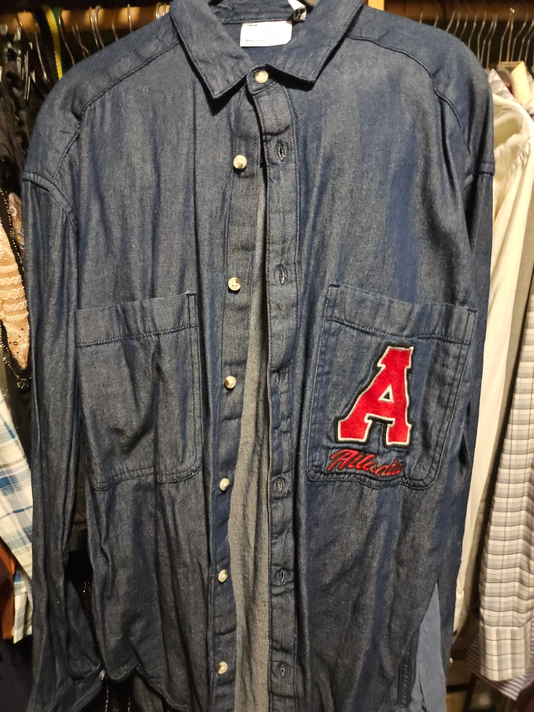 Selling an ASOS Design denim shirt in size XS. It features a red 'A' patch with 'Atlanta' embroidered below it. Great for a casual look!