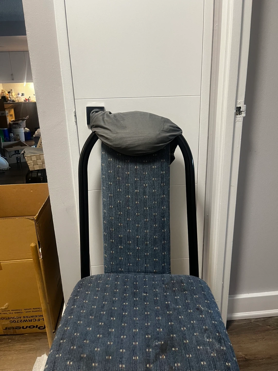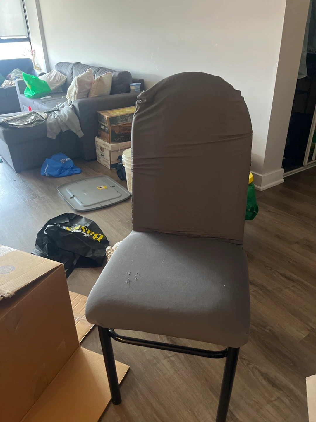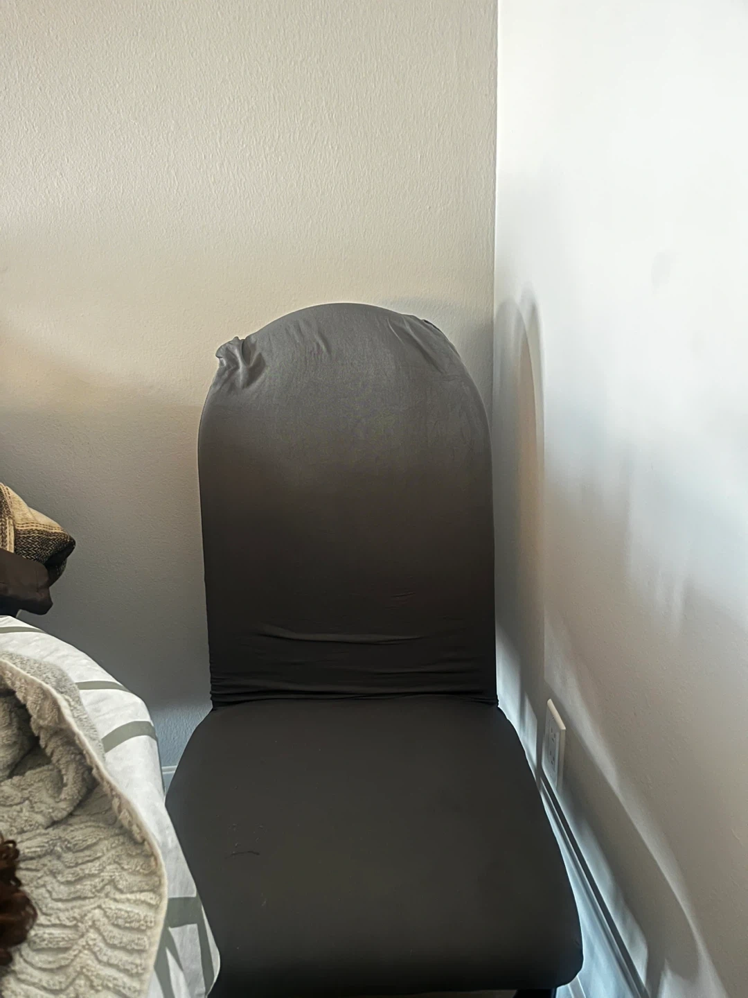 Selling a dining chair with a grey cover. It's in good condition and ready for a new home. The chair is a standard size and would fit well in any dining room or kitchen. The cover is removable and washable, making it easy to keep clean. It's a simple and functional chair for everyday use