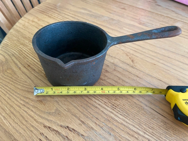 12This is a used cast iron pot ready for cooking and boiling. It could also be used for decoration as well. It shows some signs of use but is in great condition. It measures 8 inches long and 4 inches in diameter.