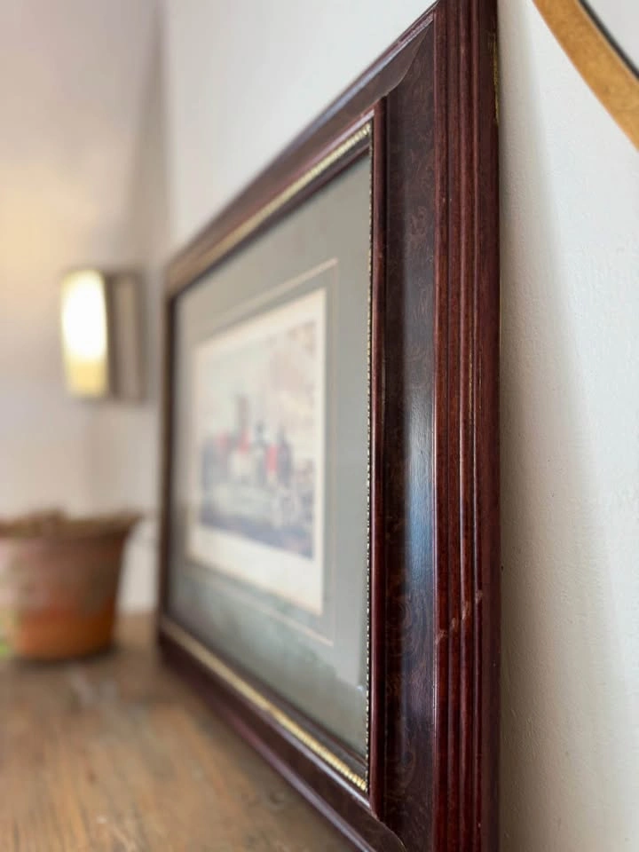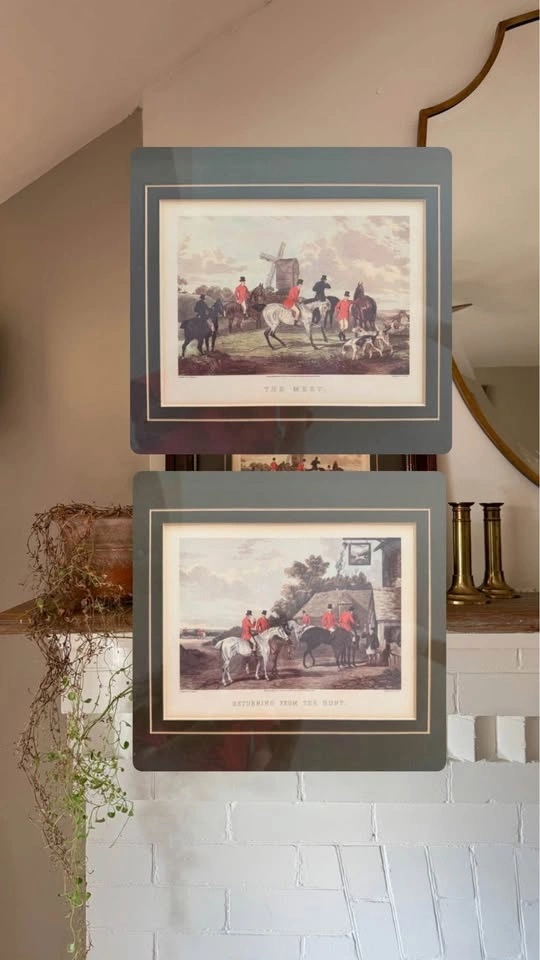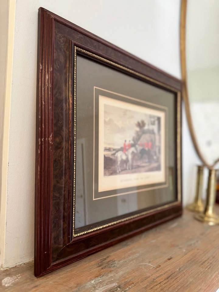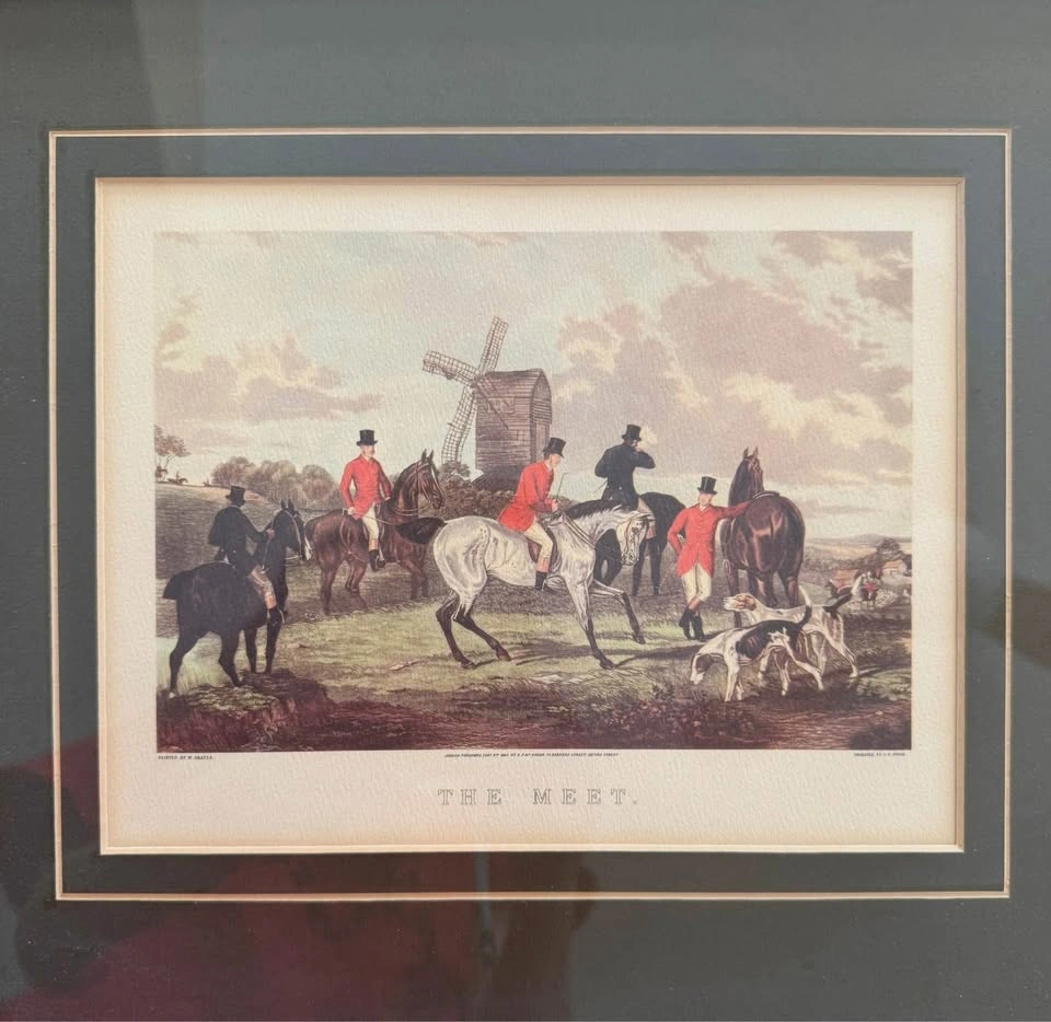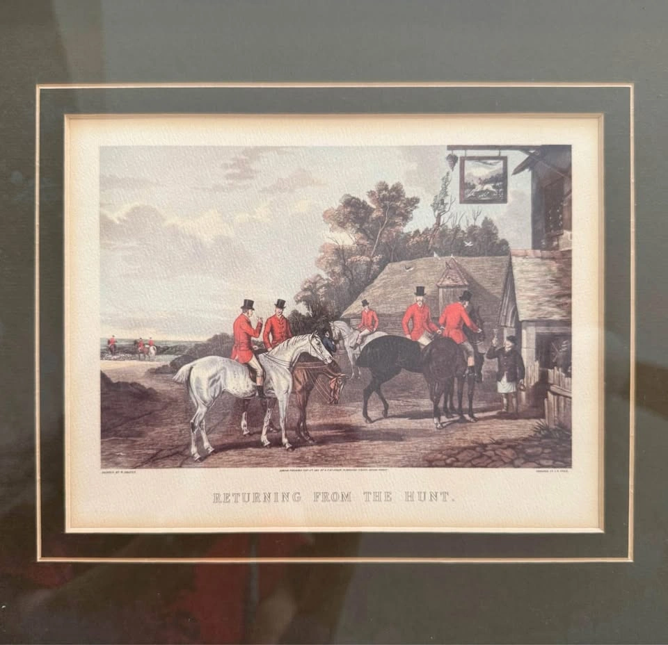 Beautiful pair of vintage framed equestrian art prints, depicting classic English fox hunting scenes. Perfect for adding a touch of traditional, grandmillennial, or classic country decor to any home, office, library, or den. Titles: "The Meet" & "Returning from the Hunt" Painted by W. Shayer (1811-circa 1885) Engraved by CR Stock Art Style: Classic English Sporting Art / Fox Hunting Overall Size (Each): 18 inches x 16 inches (approx.) Frame: Classic dark wood with gold trim. Good vintage condition. Wear consistent with age. Ready to hang! Porch pick up Christie St and St. Clair West Ave (10 min walk from St. Clair WEST Subway station). Let me know if you're interested!