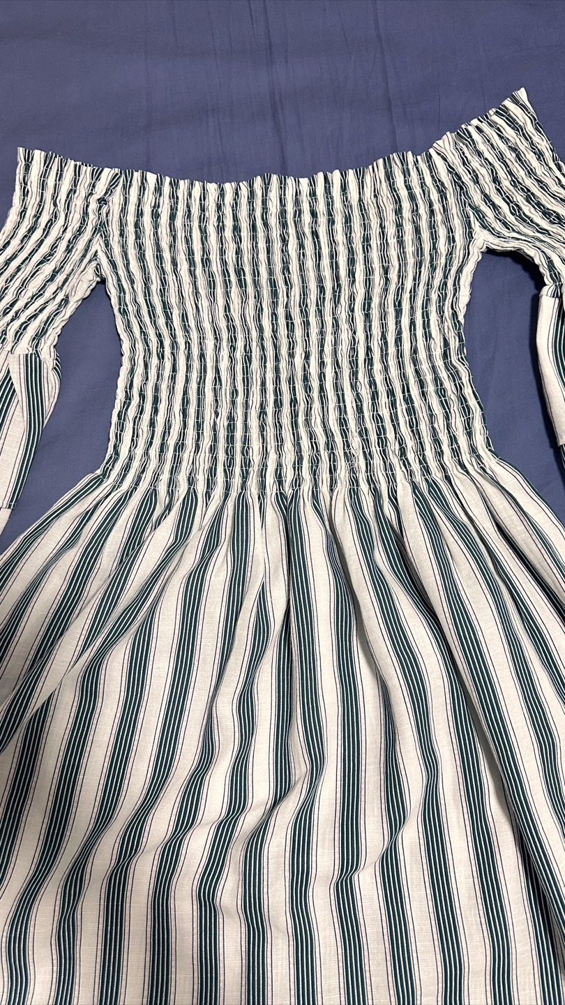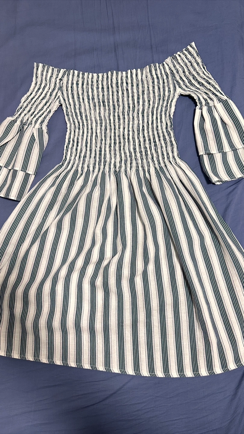 This is a cute off-the-shoulder dress with a striped pattern. It features bell sleeves and a comfortable, stretchy bodice. Perfect for a casual outing or a summer day!