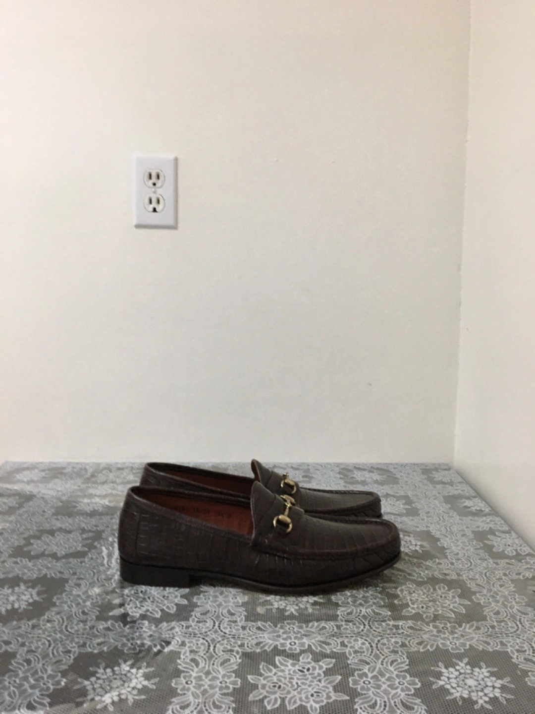 These are a pair of brown leather loafers. They have a gold-tone metal detail across the vamp. The material appears to be embossed with a crocodile-like texture. They are in good condition and would be a great addition to your wardrobe! pick up at steeles and Bathurst cash only