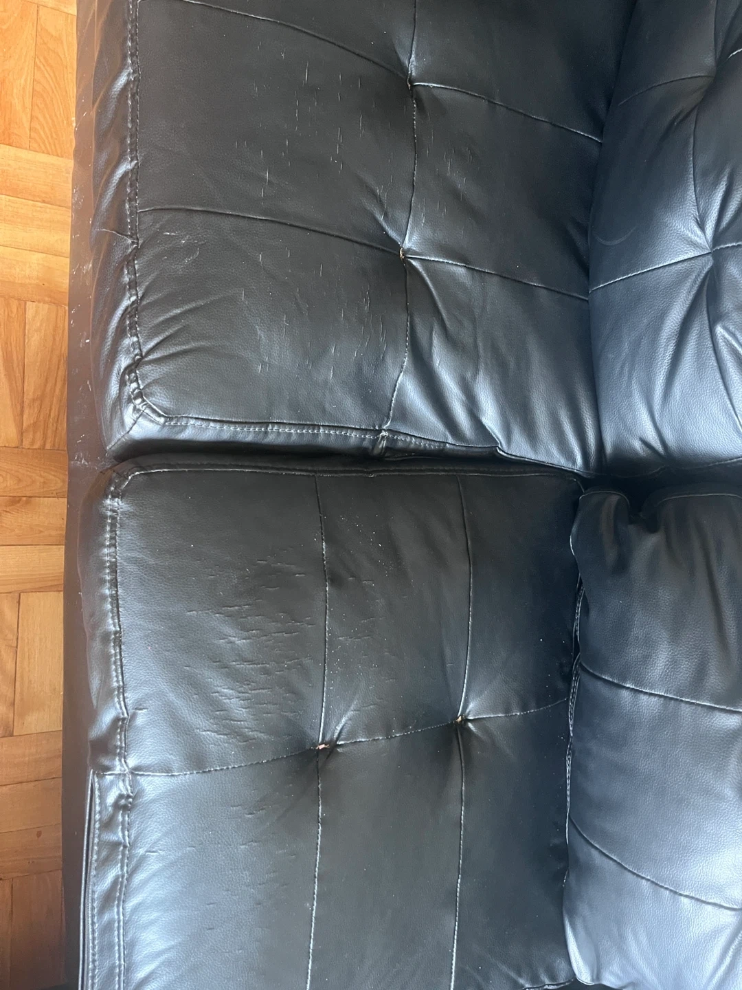 Selling a black leather sectional sofa. It has a chaise lounge and a storage compartment under the chaise. There are some signs of wear, but it's still in good condition and very comfortable!