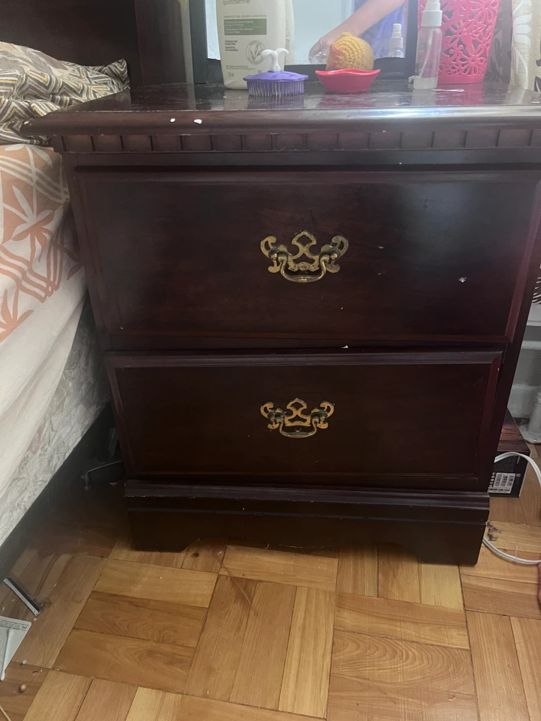 Selling a wooden nightstand with two drawers. It has a dark wood finish and ornate gold-coloured handles. Perfect for adding some storage and style to your bedside!