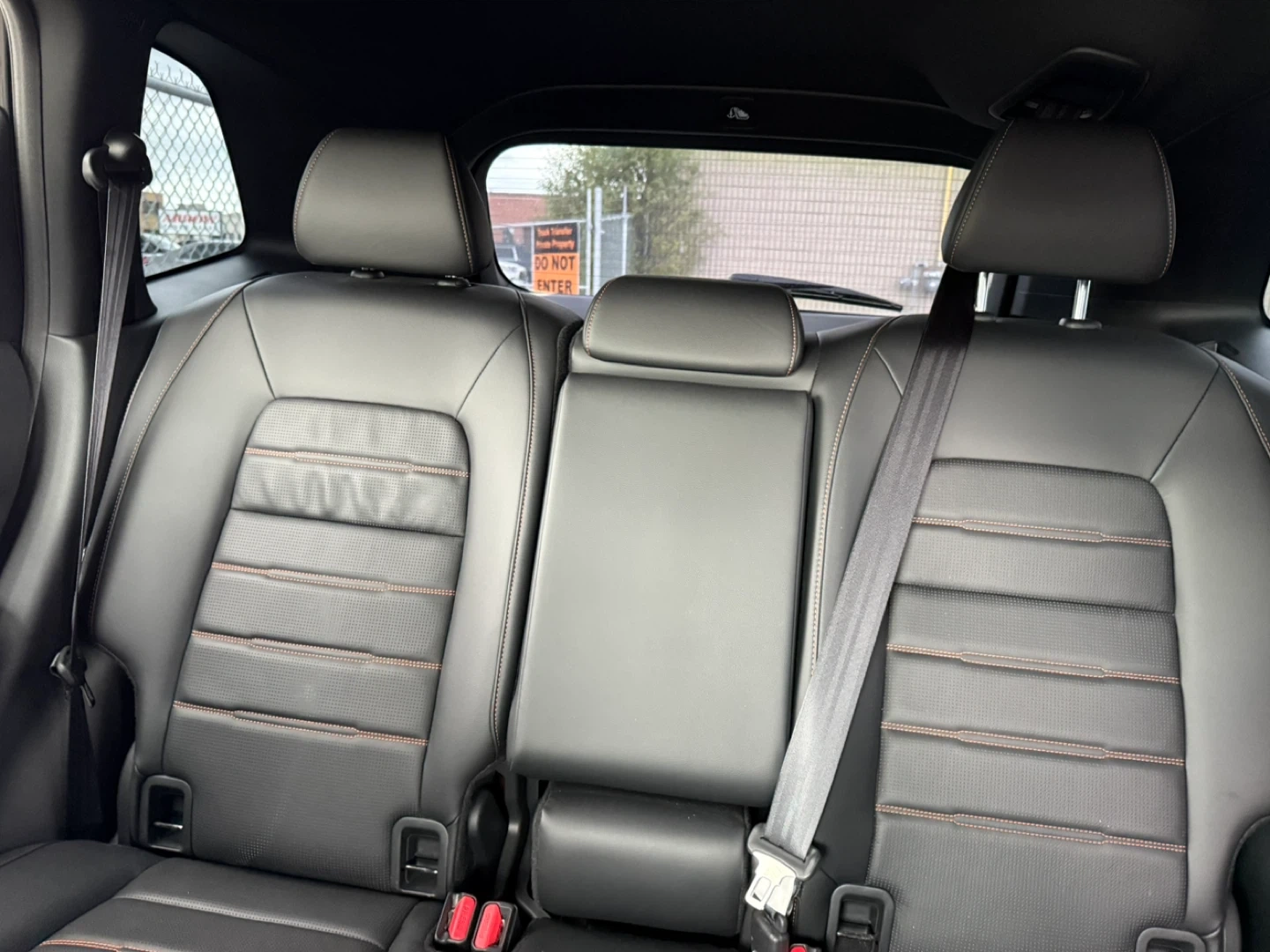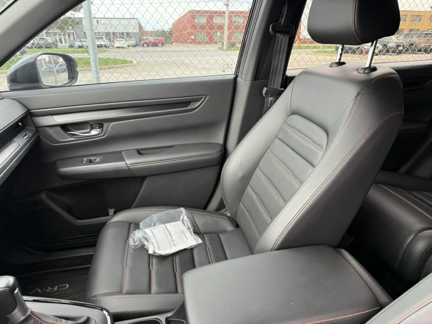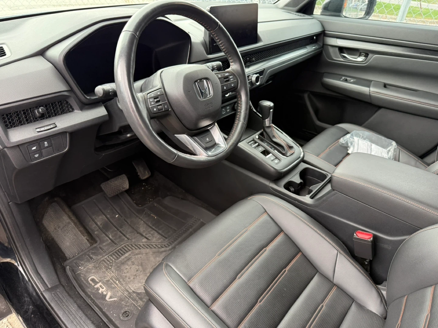Selling interior parts from a Honda CR-V. The seats are black leather with orange stitching. The dashboard includes a digital display and various controls. Interior is in good condition.