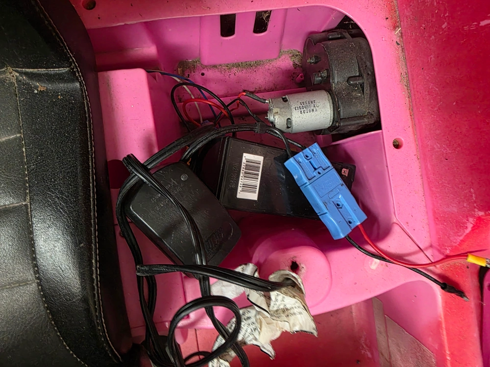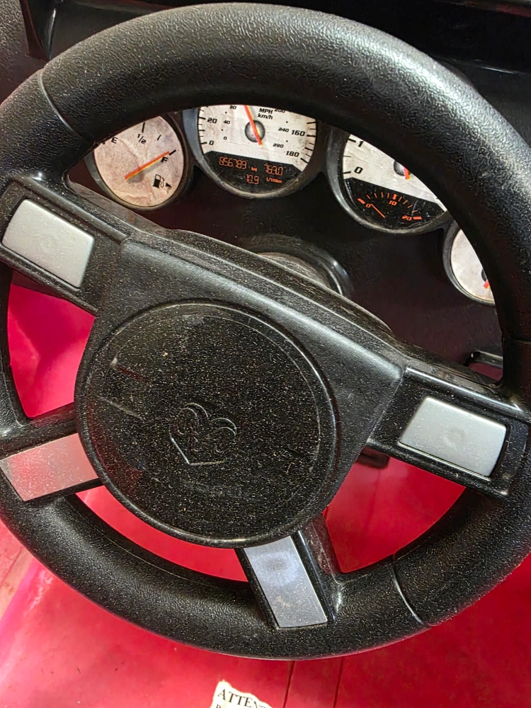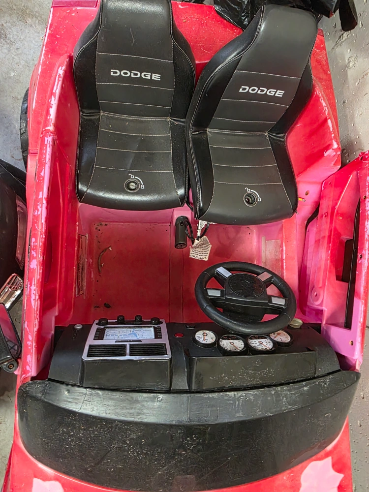 Selling a Dodge ride-on car for kids! It features Dodge branded seats, a steering wheel, and wheels. The car is red and has a dashboard with a map display. Great for little drivers!