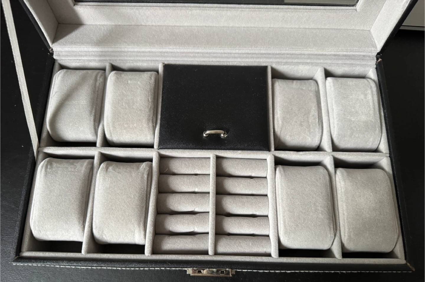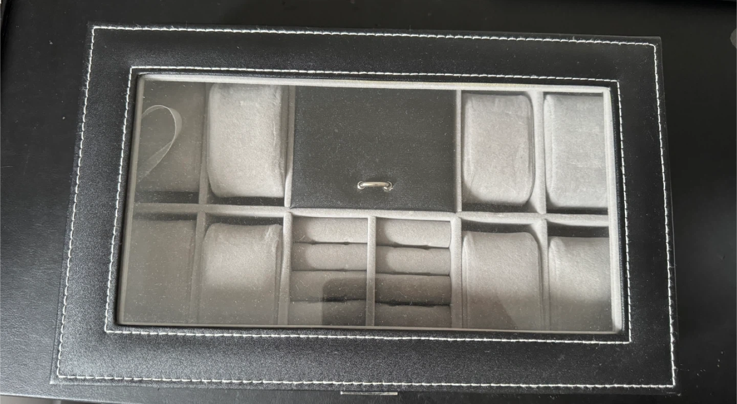 Keep your watches and jewelry organized with this stylish black leather box! It features multiple compartments for watches, rings, and other accessories. The interior is lined with soft, light grey velvet to protect your valuables. The box has a glass top so you can easily see your collection.