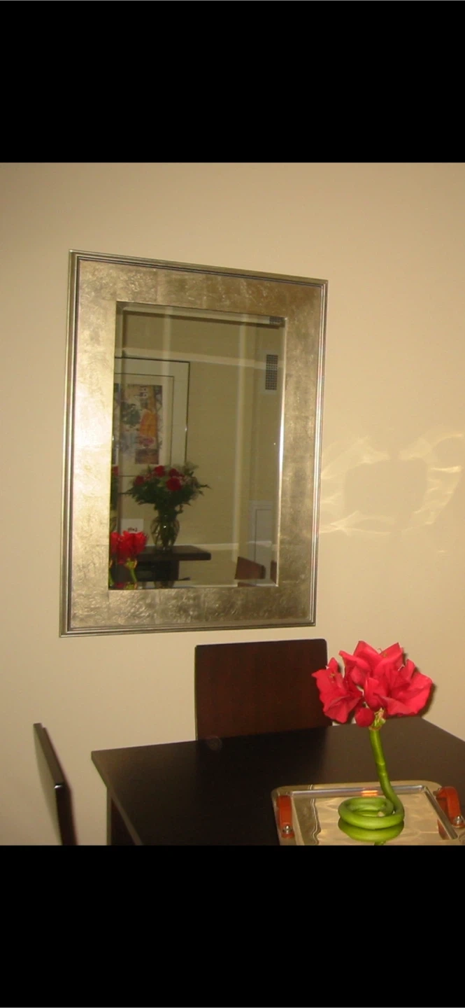 Selling a lovely gold-framed wall mirror. It's approximately 41.5 inches by 29.5. Could be hang either way. The frame has a distressed look that gives it a unique and interesting look.