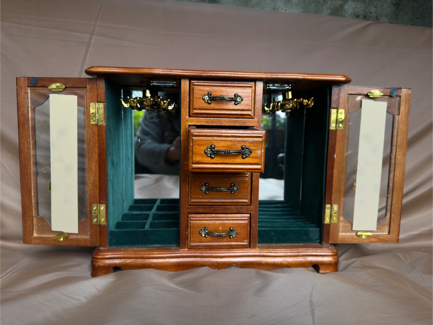 32Here's a lovely vintage wooden jewelry box, perfect for organizing your precious items! It features multiple drawers and side doors, providing ample storage space. The box is in good condition and ready to find a new home. It's a great way to keep your jewelry safe and tidy!