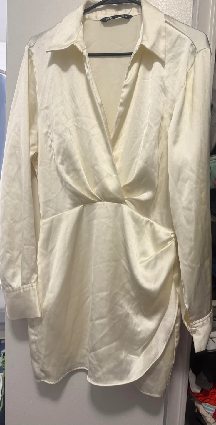 Selling a cream-coloured satin shirt dress from Zara! It's in great condition and ready for a new home. Perfect for dressing up or down, this dress is a versatile addition to any wardrobe