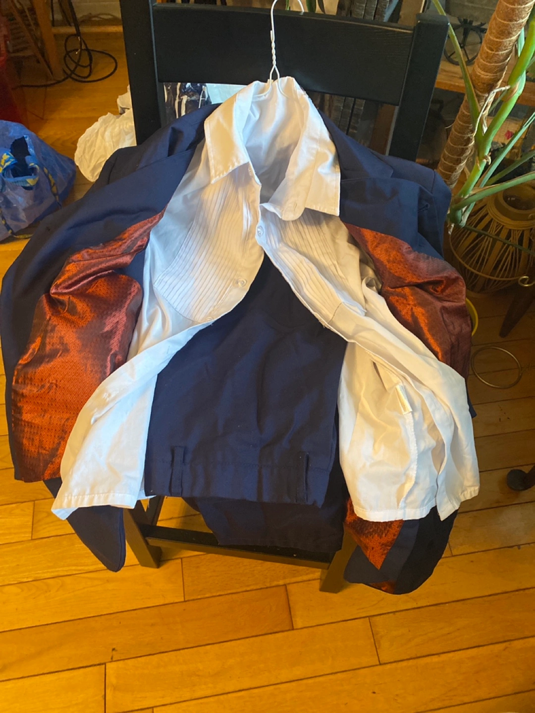 Selling a navy blue suit set. It includes a jacket, vest, dress shirt, and pants. Great for a formal occasion!