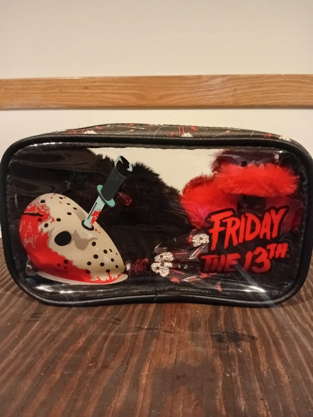 This set includes a fuzzy black scrunchie with a Jason mask charm and a red fuzzy claw clip with Jason's hockey mask. It all comes in a clear pouch featuring Friday the 13th graphics. These accessories are a fun way to show off your horror fandom!