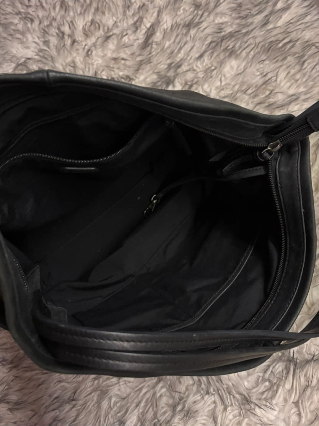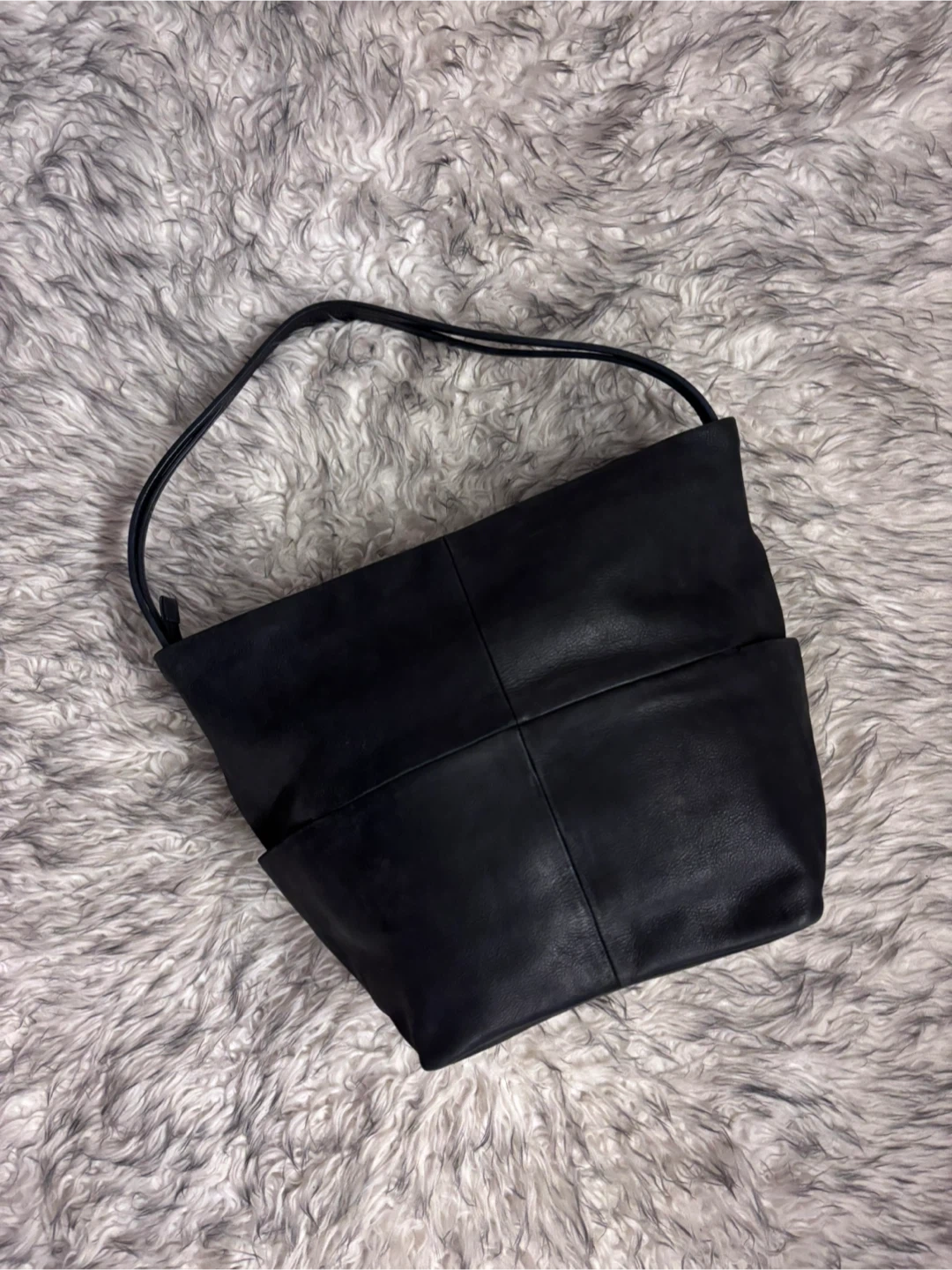 This elegant soft black leather shoulder bag is perfect for any occasion. Its sleek design and high-quality material make it a must-have accessory. It has pockets on the sides, some inside. Has loads of space.