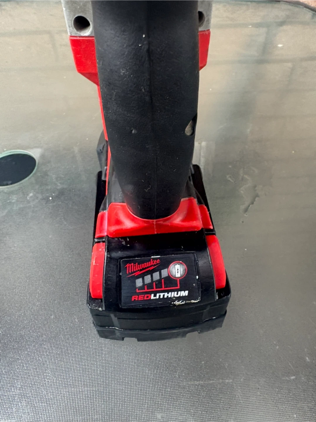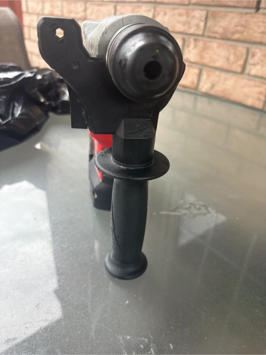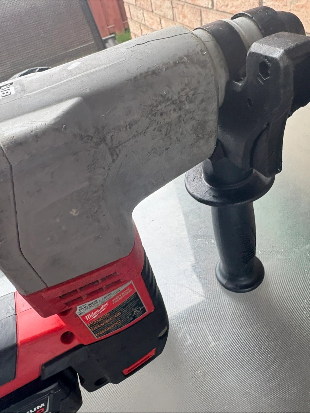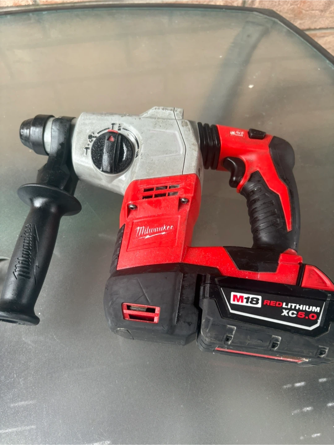 Selling a Milwaukee M18 rotary hammer drill. It shows signs of use but is in good working condition. It comes with an M18 REDLITHIUM XC 5.0 battery.