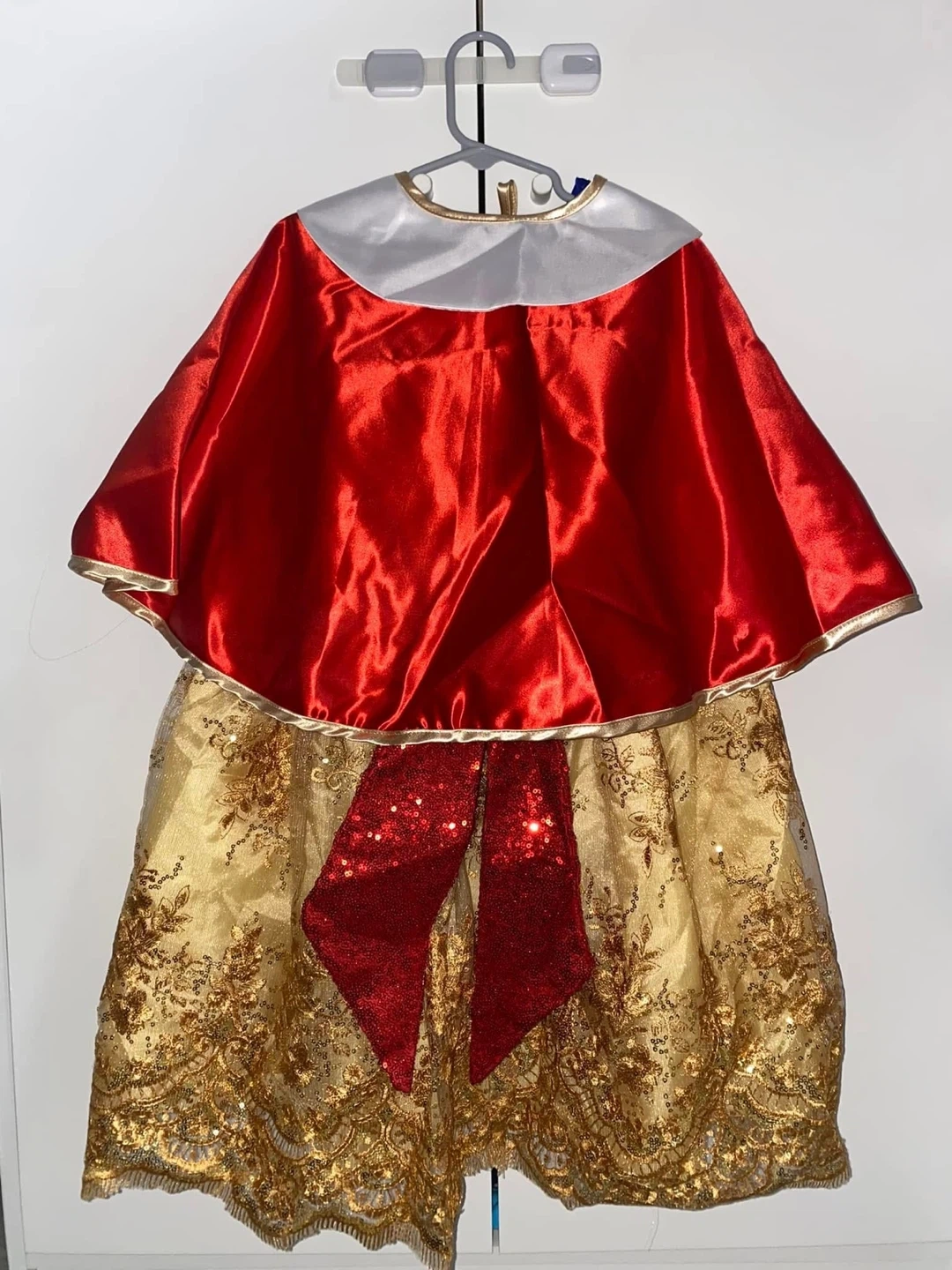 For sale. Preloved SNOW WHITE COSTUME. Adorable Snow White dress with a matching cape! The dress features a blue sequin top, a gold skirt with intricate detailing, and a large red bow in the back. The cape is red with white trim. Perfect for dress-up or a costume party. RFS. Decluttering. Bought it from Etsy for $95, selling for $45. In very good condition. For pick up. Size 2-3YO.