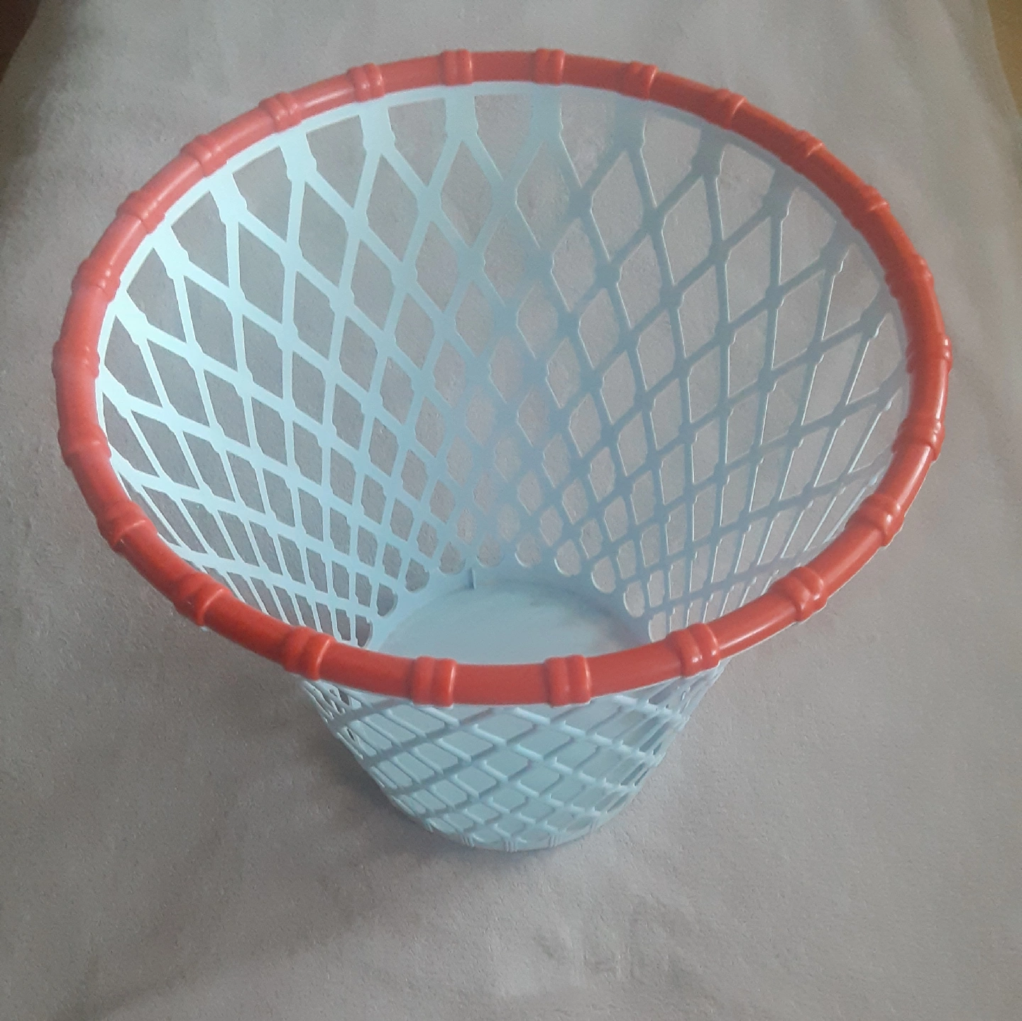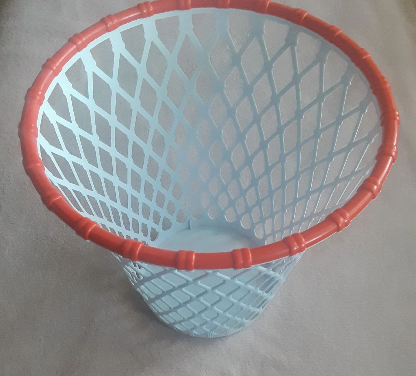 Selling a waste basket shaped like a basketball hoop. It's in great condition and would be perfect for a kids' room or a sports-themed space! The basket is white with a red rim.