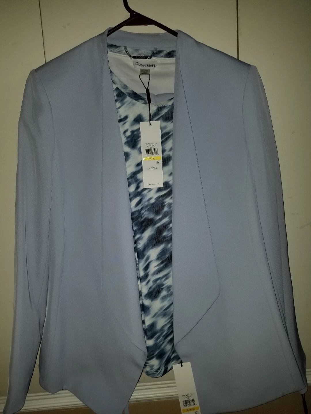 Selling a brand new Calvin Klein set! It includes a blazer, top, and pants. All items are in excellent condition and still have their tags on. The blazer and pants are a light blue colour, while the top has a blue and white pattern. Perfect for a professional or stylish look! Was going to use for a wedding but never did paid $350 asking $200 to $100. Size Medium. pick up north end of St. Catharines