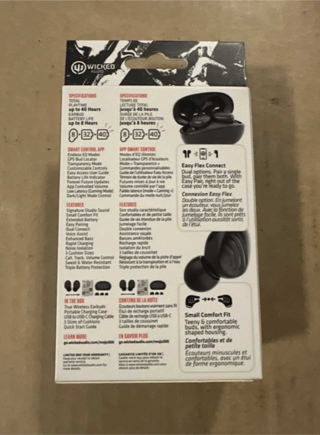 71Selling a brand new pair of Wicked Audio Mojo 300 True Wireless Earbuds! - Up to 40 hours of playtime - Easy Flex Connection - Sweat and water resistant - GPS bud locator - Signature studio sound - Dual connect - Noise isolation - Call, track, volume control - Triple battery protection Included in the box: - Wireless Earbuds - Portable Charging Case - USB-C Charging Cable - 3 Sizes of Cushions - Quick Start Guide