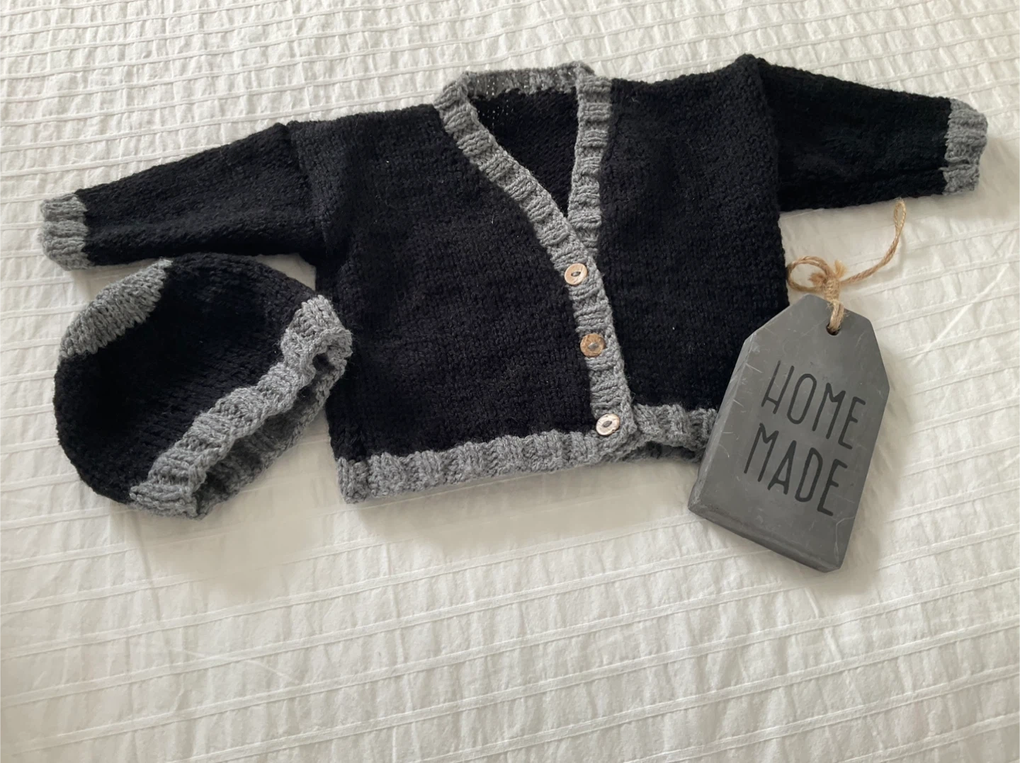 A super cute, handmade baby cardigan and hat set! The cardigan is black with grey trim and has little wooden buttons. The matching hat is also black and grey. Perfect for keeping your little one warm and stylish