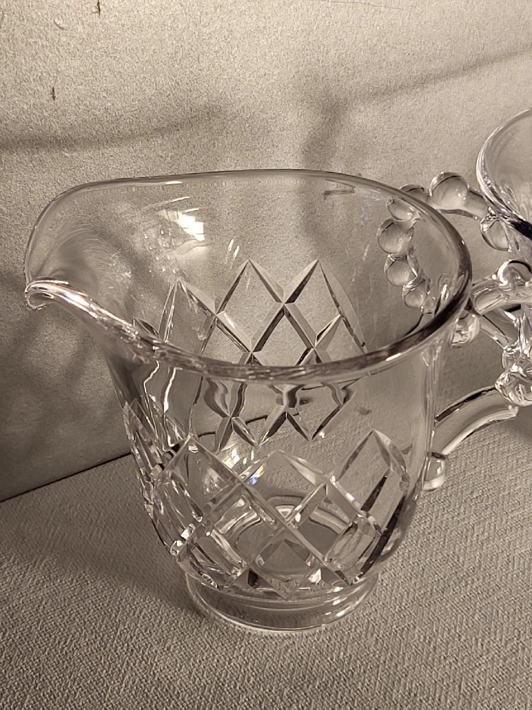 Selling a lovely crystal sugar bowl and creamer set. The pieces have a beautiful diamond pattern and unique handles. They're in great condition and would make a wonderful addition to any table setting!