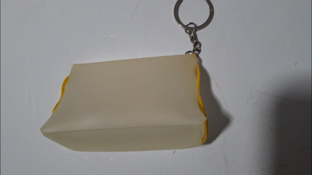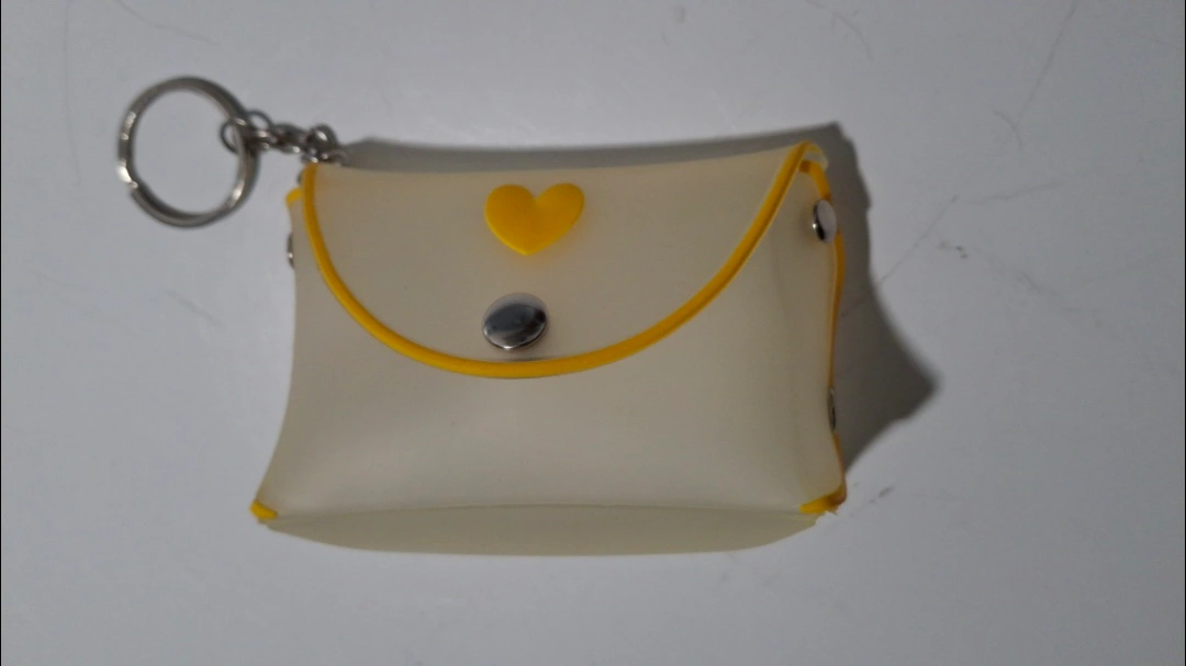 This is a super cute coin purse keychain! It's a soft, off-white colour with a bright yellow trim and a sweet little yellow heart detail. Perfect for keeping your change or small treasures safe and adding a bit of charm to your keys or bag