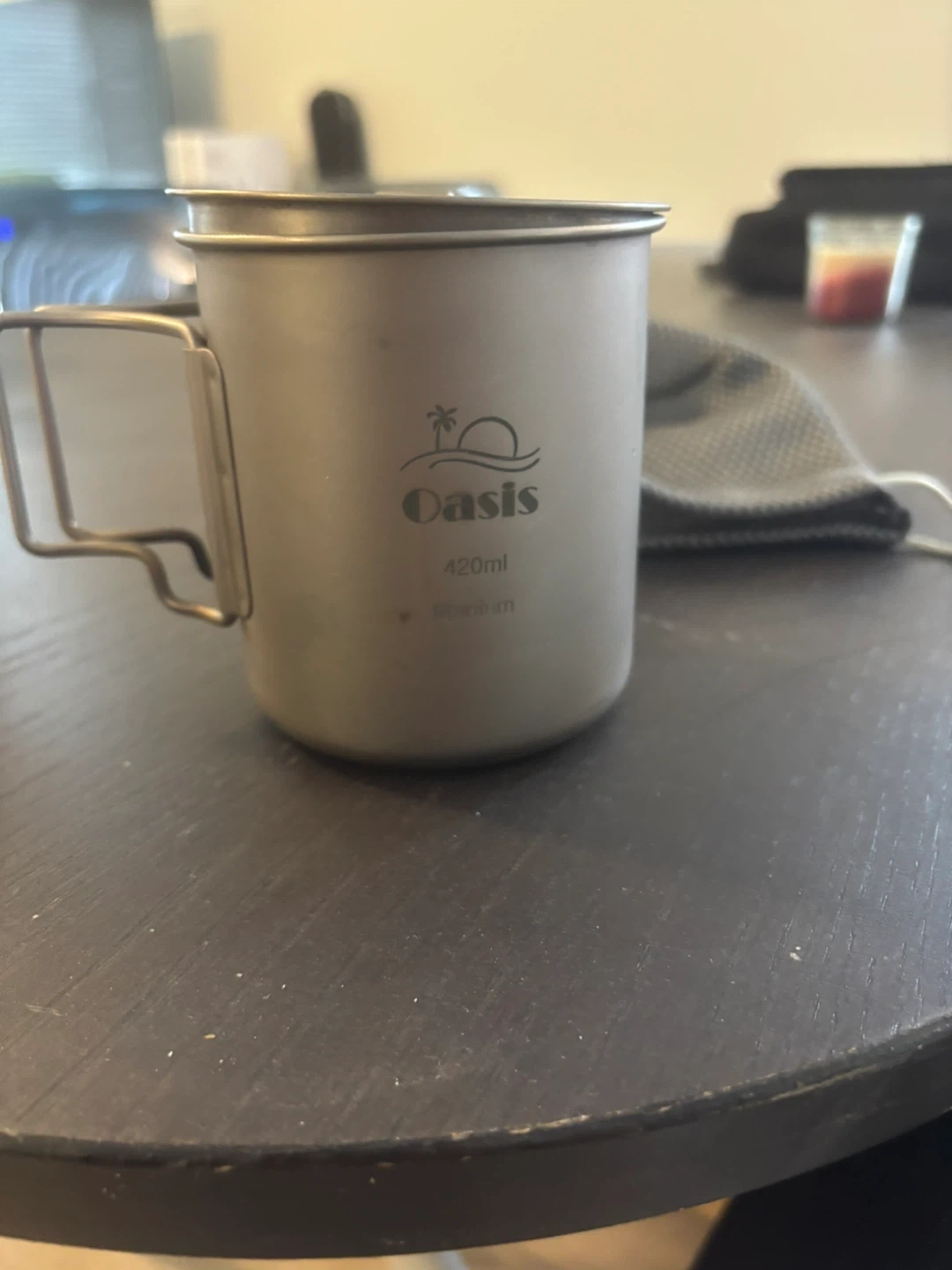 Selling an Oasis titanium mug with a 420ml capacity. It comes with a lid and a mesh storage bag. It's lightweight and perfect for camping or backpacking.