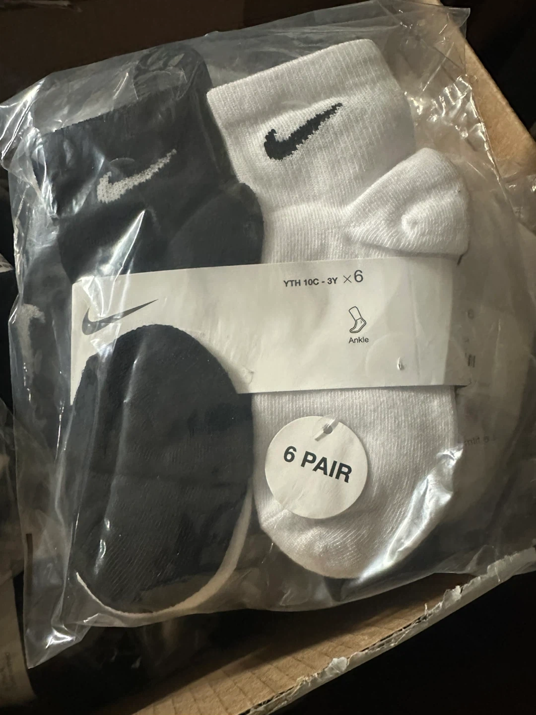 I have new packs of Nike youth ankle socks. Each pack contains 6 pairs of socks in black and white. Size is YTH 10C-3Y.