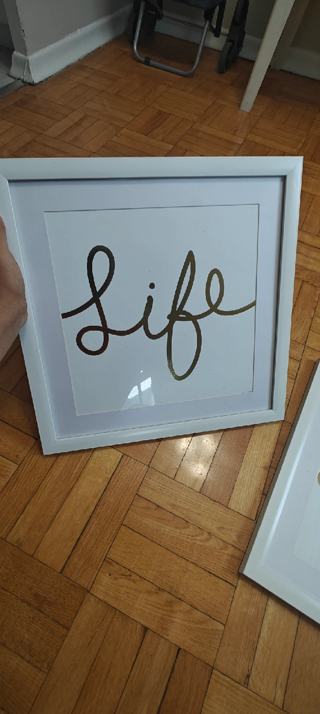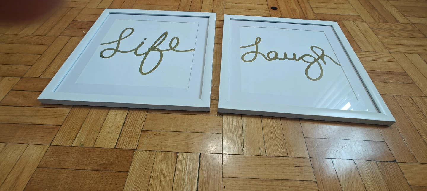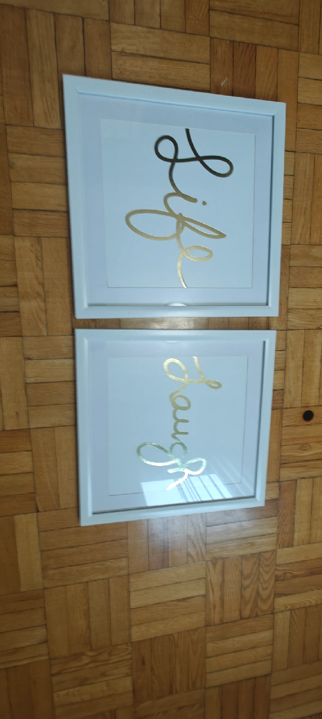 207Selling a set of two framed wall art pieces. One says "Life" and the other says "Laugh" in a stylish gold script. The frames are white and in great shape! Perfect for adding a touch of inspiration to any room. Also check my other Listings too😊