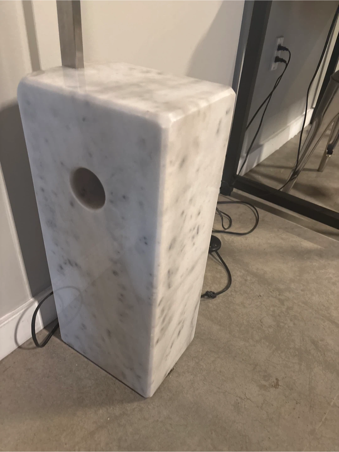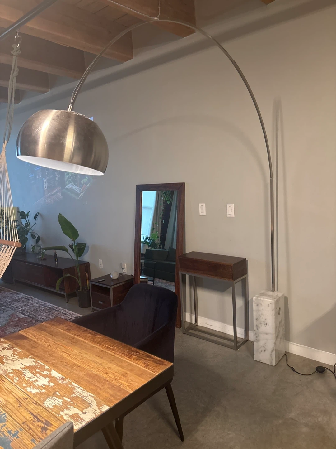 Selling a stylish arc floor lamp! It features a sleek, modern design with a sturdy marble base. Perfect for adding ambient lighting to any room in your home. It's in great condition and ready to brighten up your space!