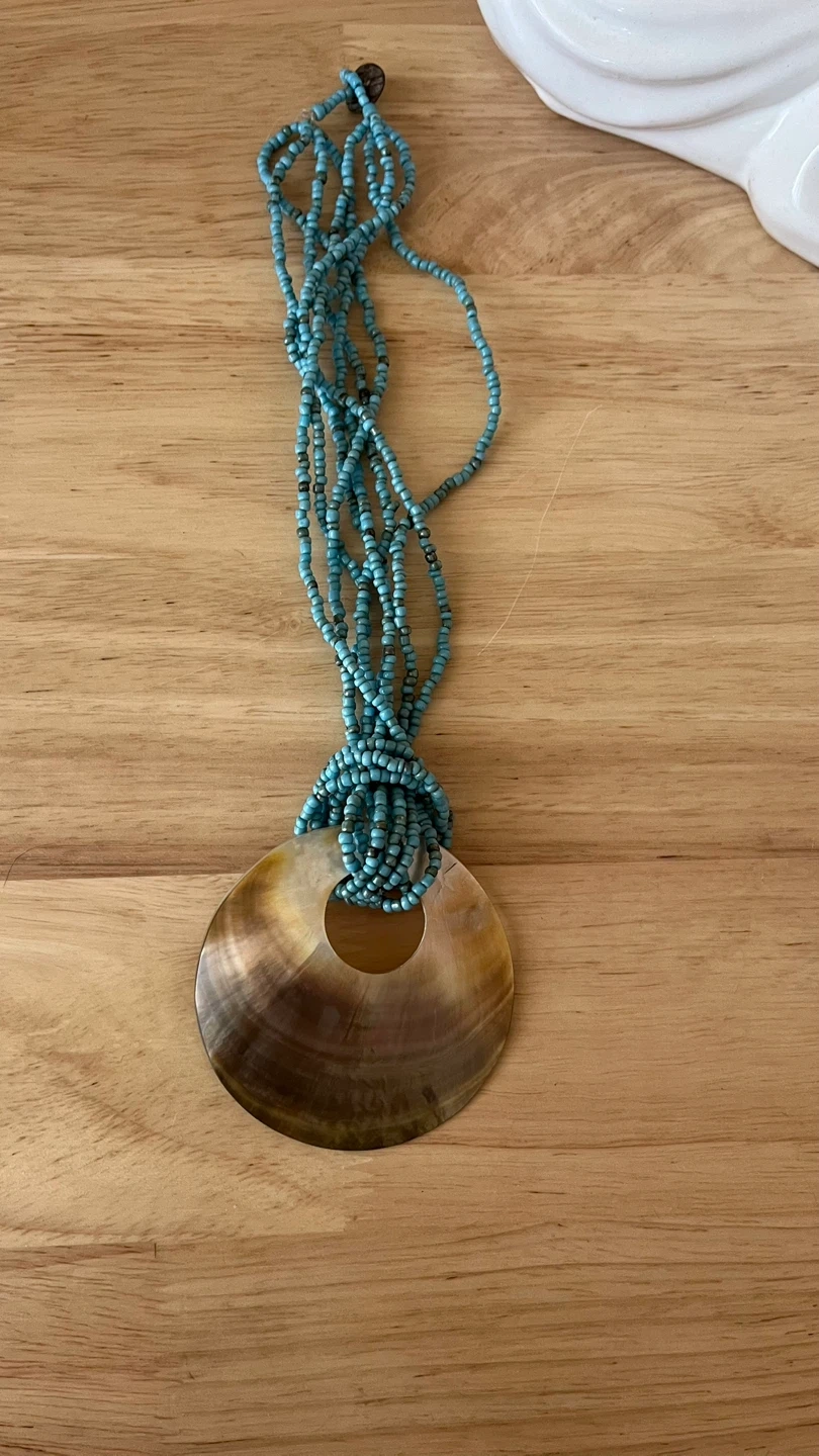 Beautiful shell pendant necklace with turquoise beads. It's in great condition and ready to add a touch of boho chic to your outfit!