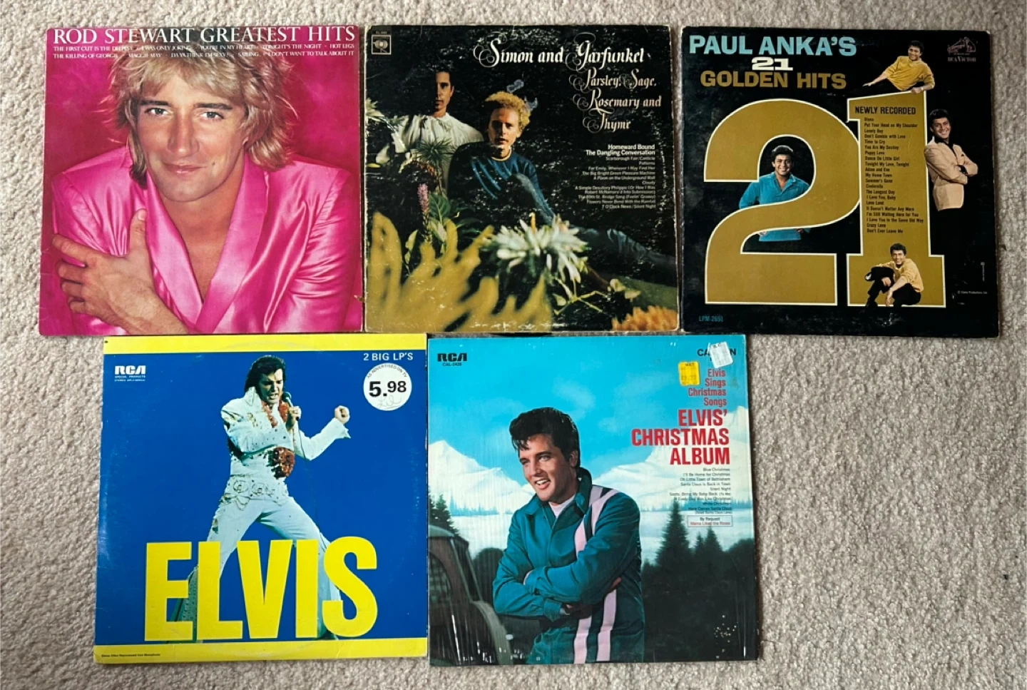 Selling a collection of vintage vinyl records! Includes albums from Rod Stewart, Simon and Garfunkel, Paul Anka, and Elvis. Great for collectors or anyone looking to add some classic tunes to their collection. Some wear and tear on the covers, but the records themselves are in decent condition