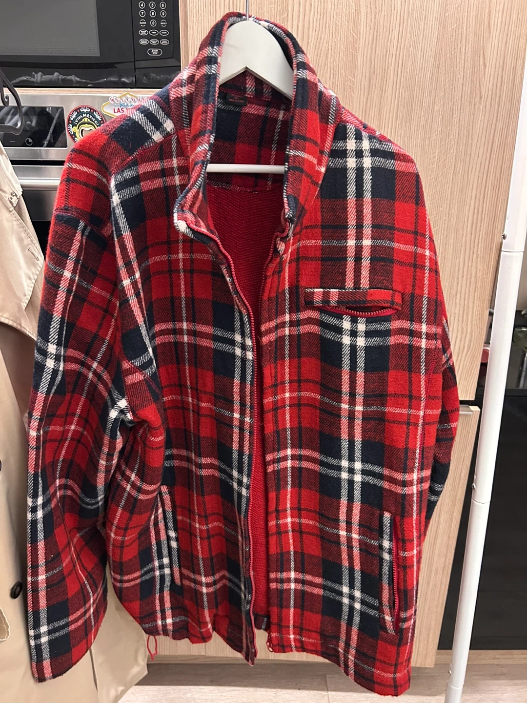 Cozy 2XL red plaid jacket for sale! It's made of 80% wool and 20% acrylic, perfect for staying warm on chilly days