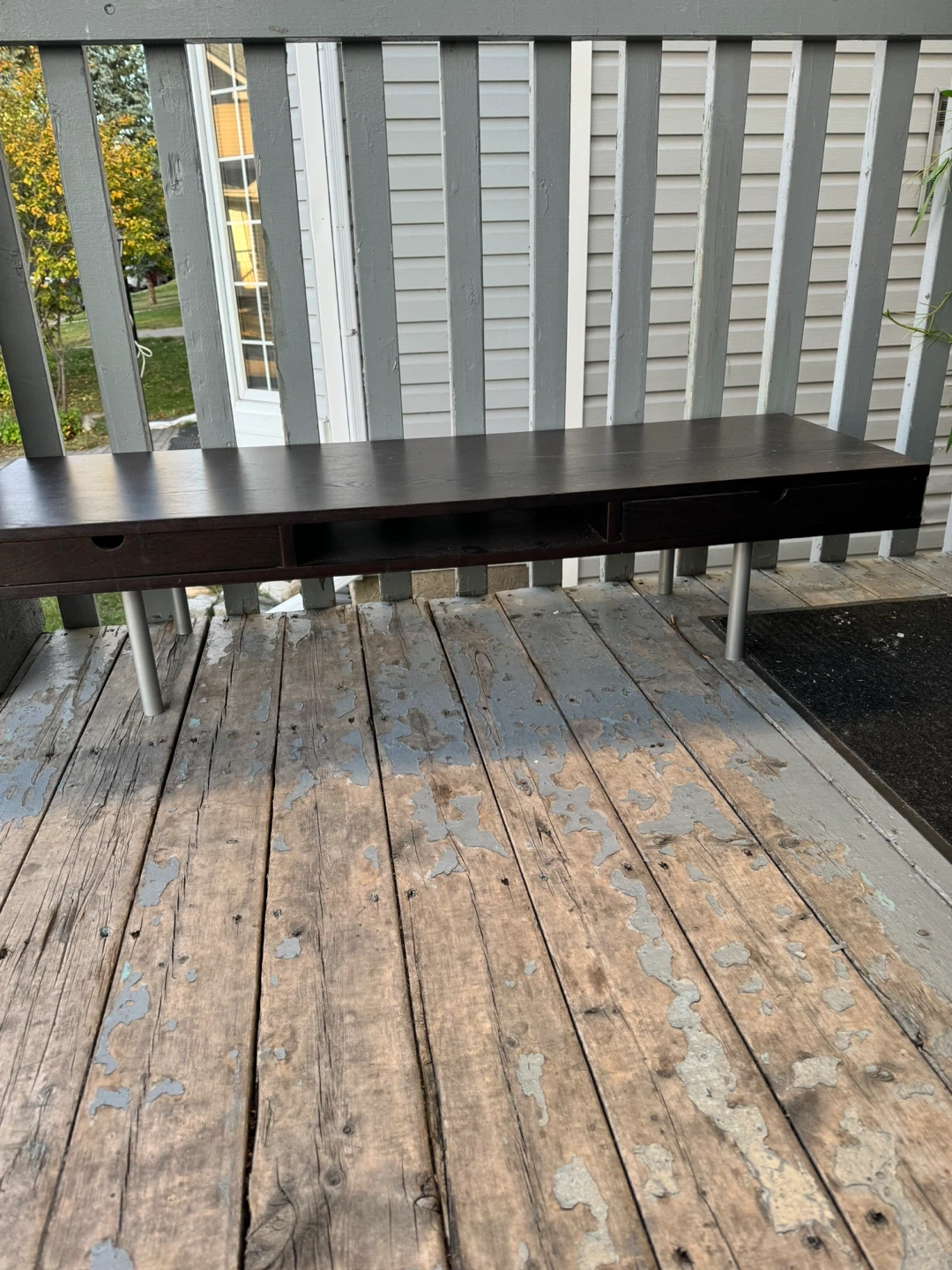 Selling a brown wooden TV stand. It has a sleek design with drawers and open shelving for your media devices or decor. Perfect for adding a touch of style to your living room!