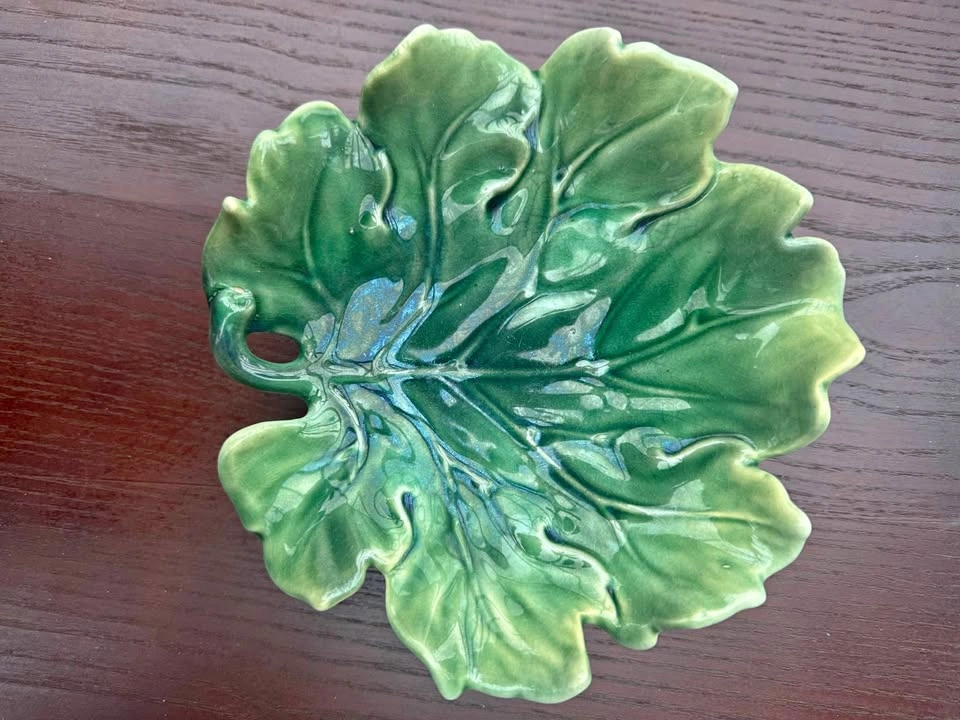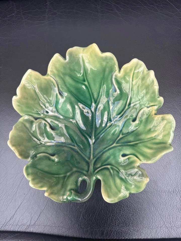 Beautifully glazed vintage majolica old leaf footed serving or display dish. Vibrant glossy finish, highly detailed with lovely ruffled edges. Approximately 7 1/2 inches wide. Cash only please. No hold. Available for pick up in the Kingston Road and Danforth area.