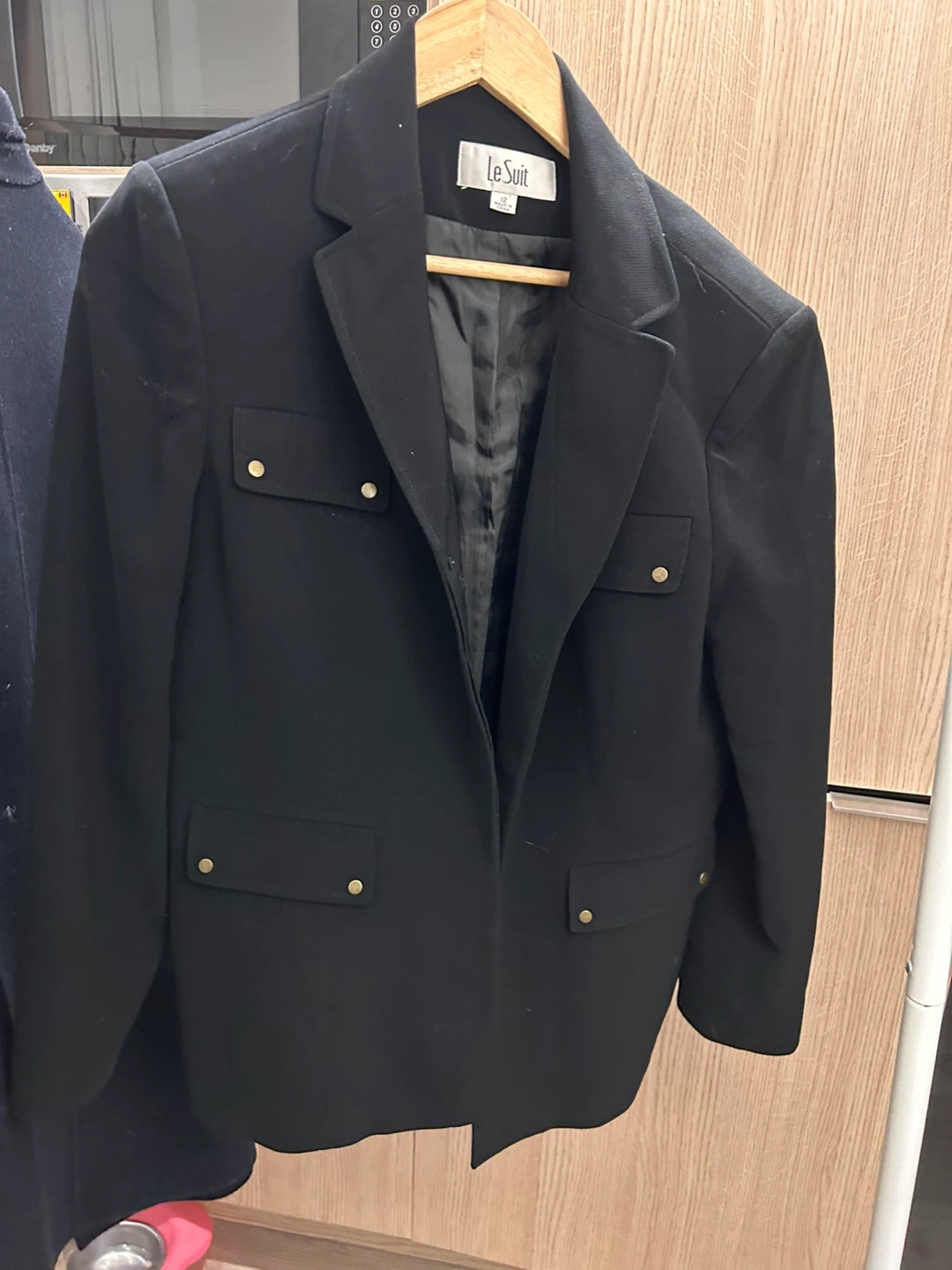Selling a Le Suit black blazer in size 12. It's in great condition and ready to wear! The blazer features a classic design with functional pockets and a smooth lining. Perfect for a professional or stylish casual look