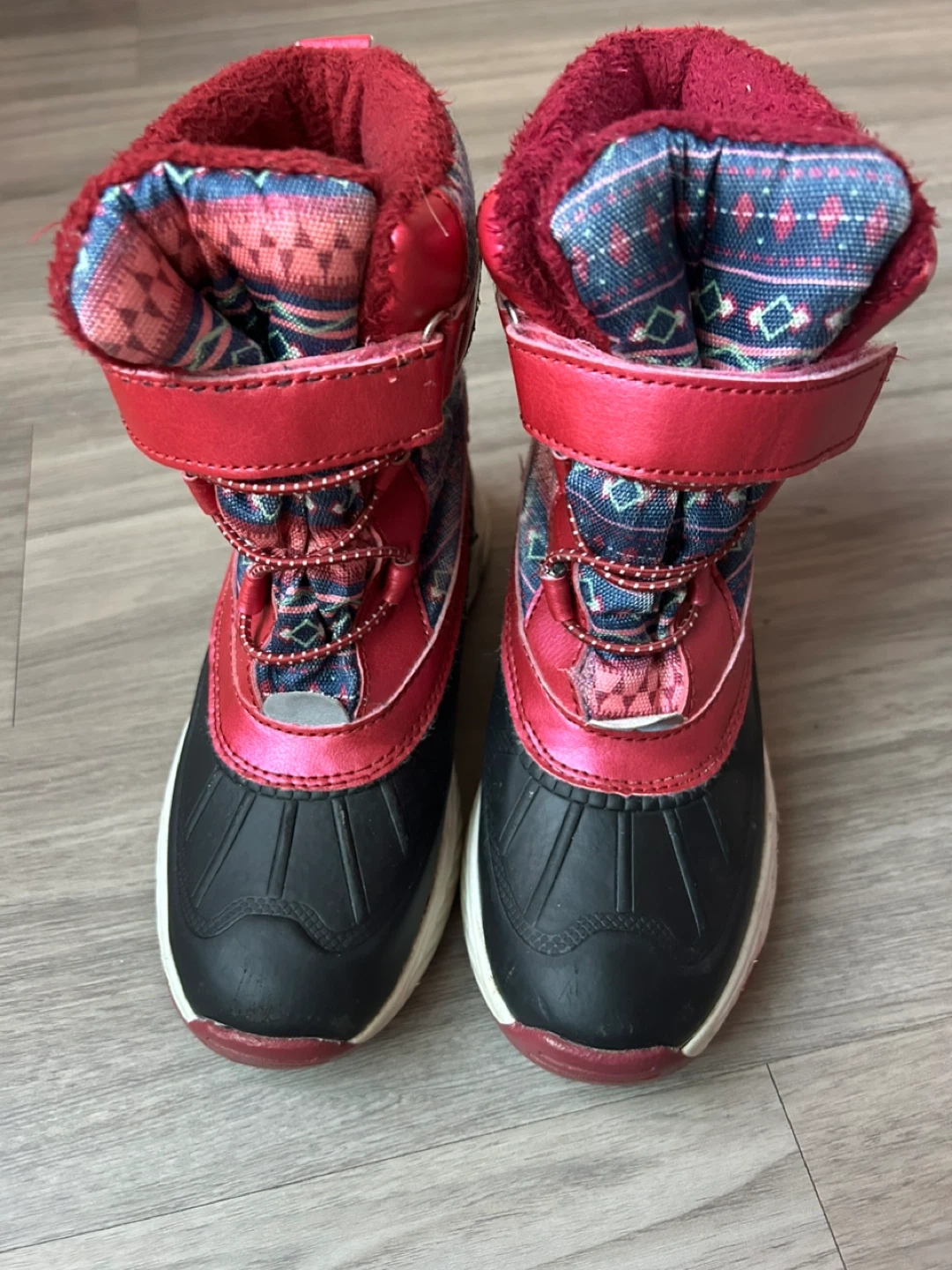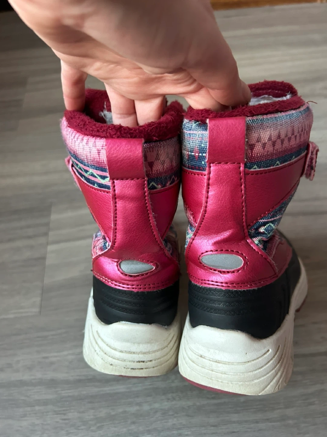 Keep your little one's feet warm and stylish with these adorable pink and black winter boots! They're in good condition and ready for some snowy adventures. The boots feature a comfortable lining and a secure velcro strap for easy on and off. Size 13.